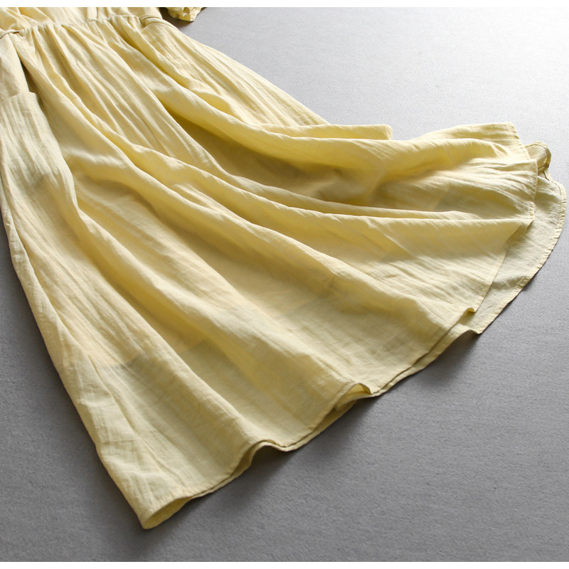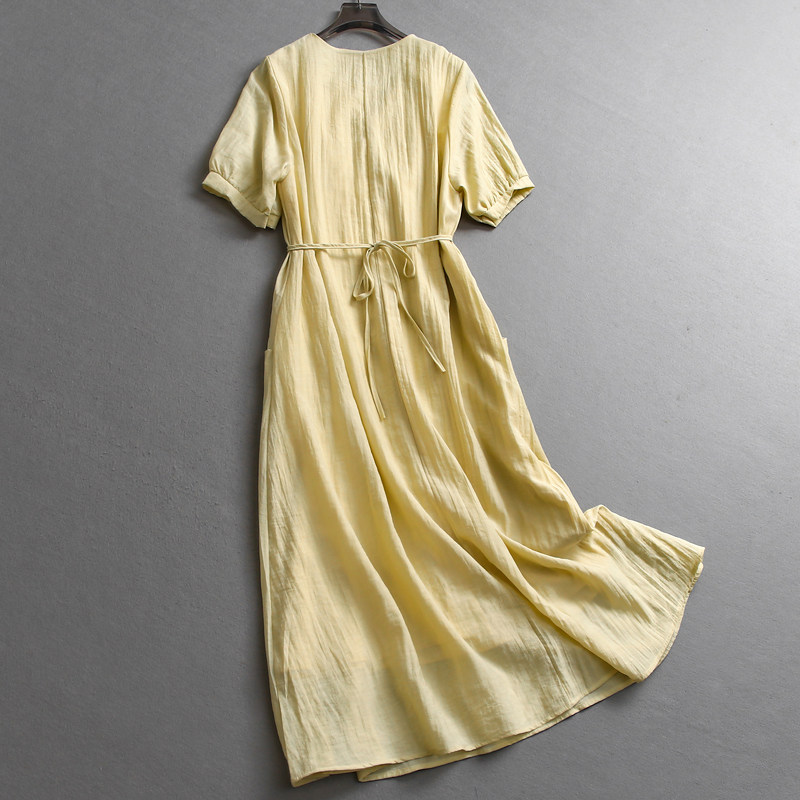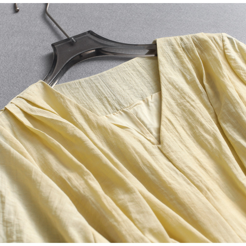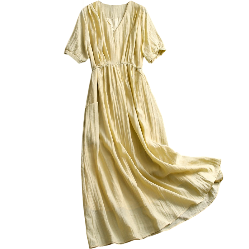 纯色系带捏褶收腰显瘦V领法式风2025夏季新款短袖女裙连衣裙X112