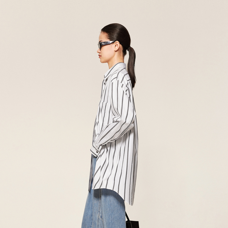 LESS通勤条纹上衣女春秋休闲男友风全棉宽松长袖衬衫女2O0210510