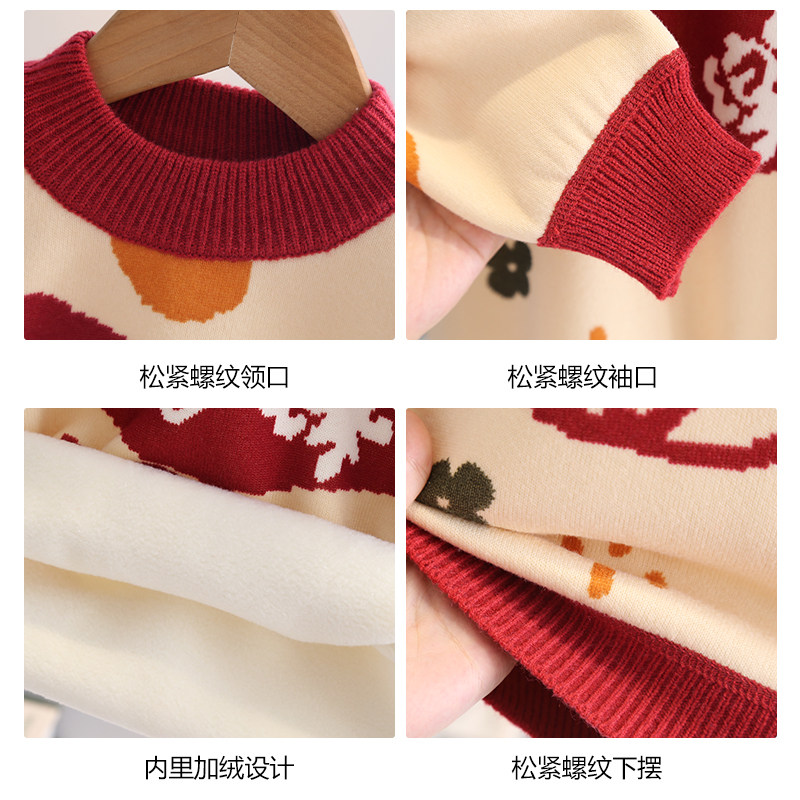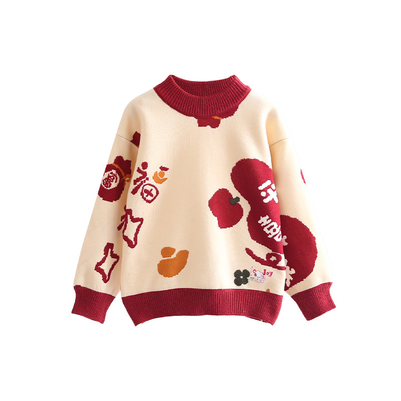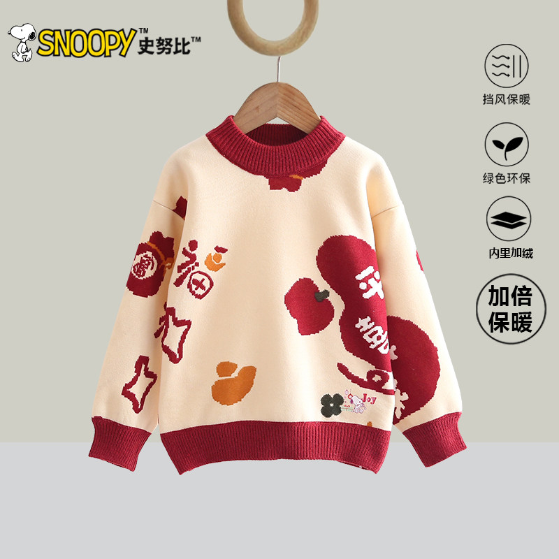 史努比女童红色毛衣加厚拜年服秋冬2025新款男童新年半高领针织衫