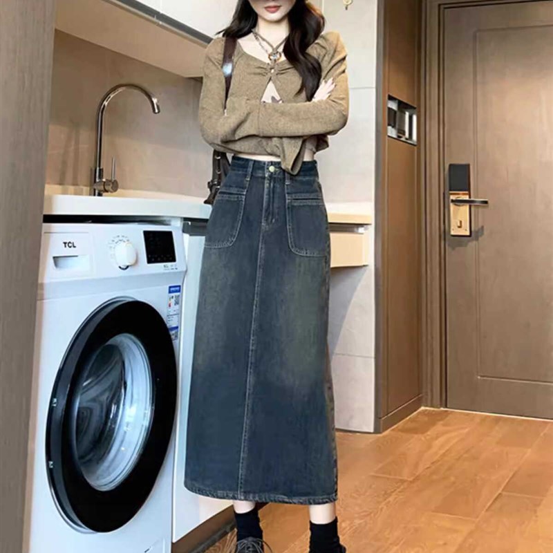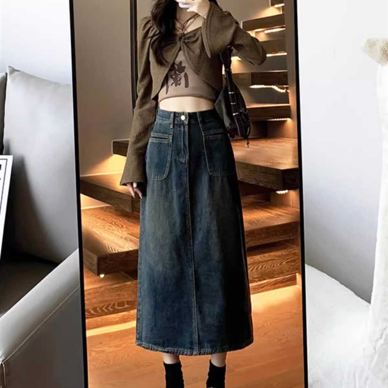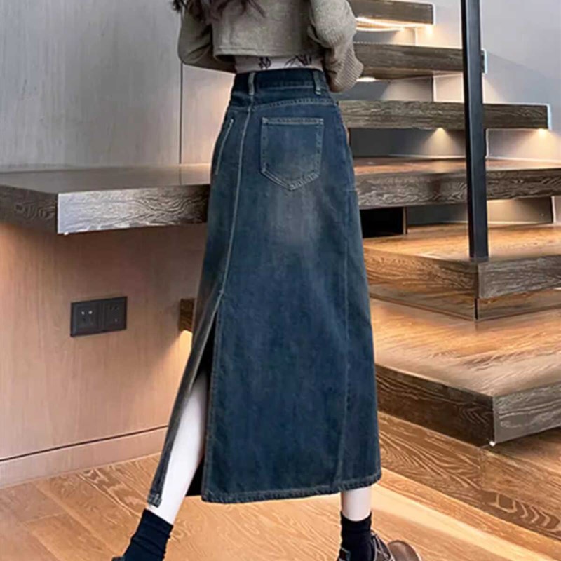 高腰复古牛仔半身裙女夏季新款中长款小个子开叉a字长裙包臀裙子