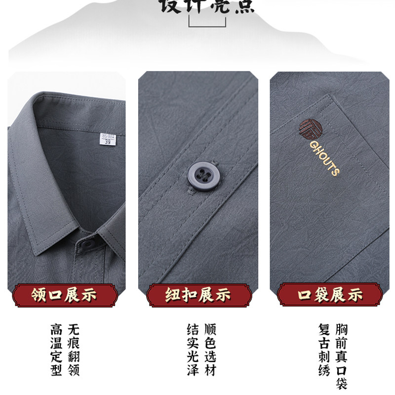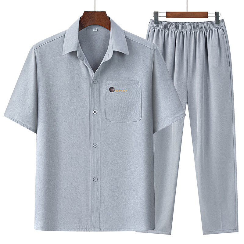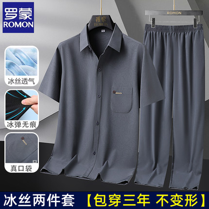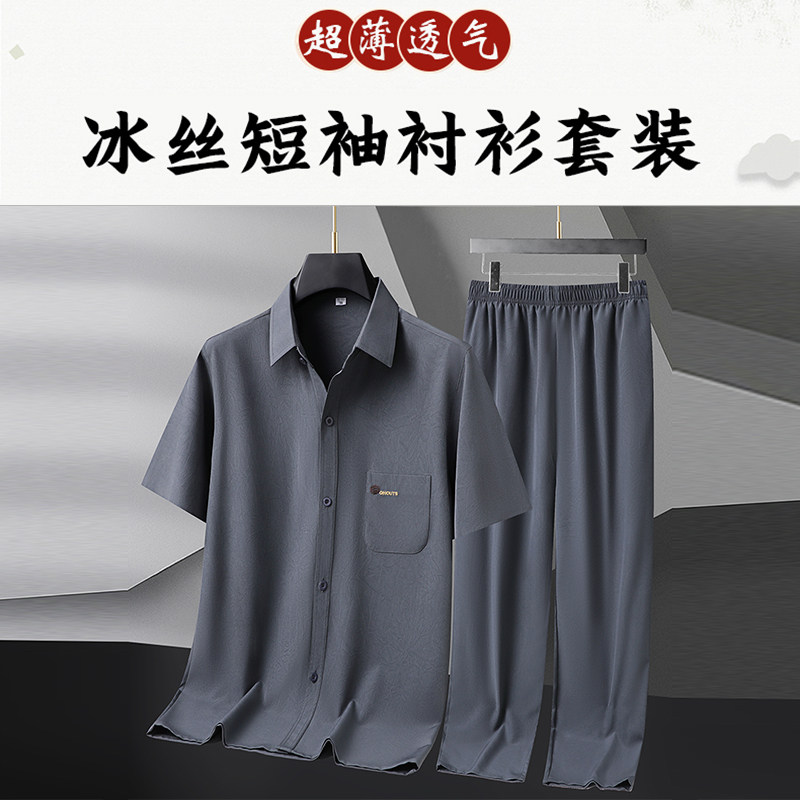 罗蒙夏季中老年冰丝短袖衬衫男老人长袖套装爷爷男装秋季唐装礼物