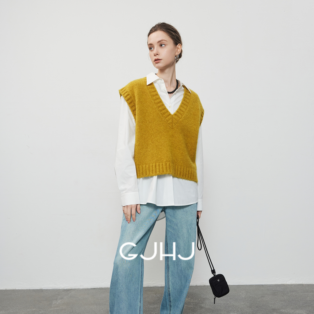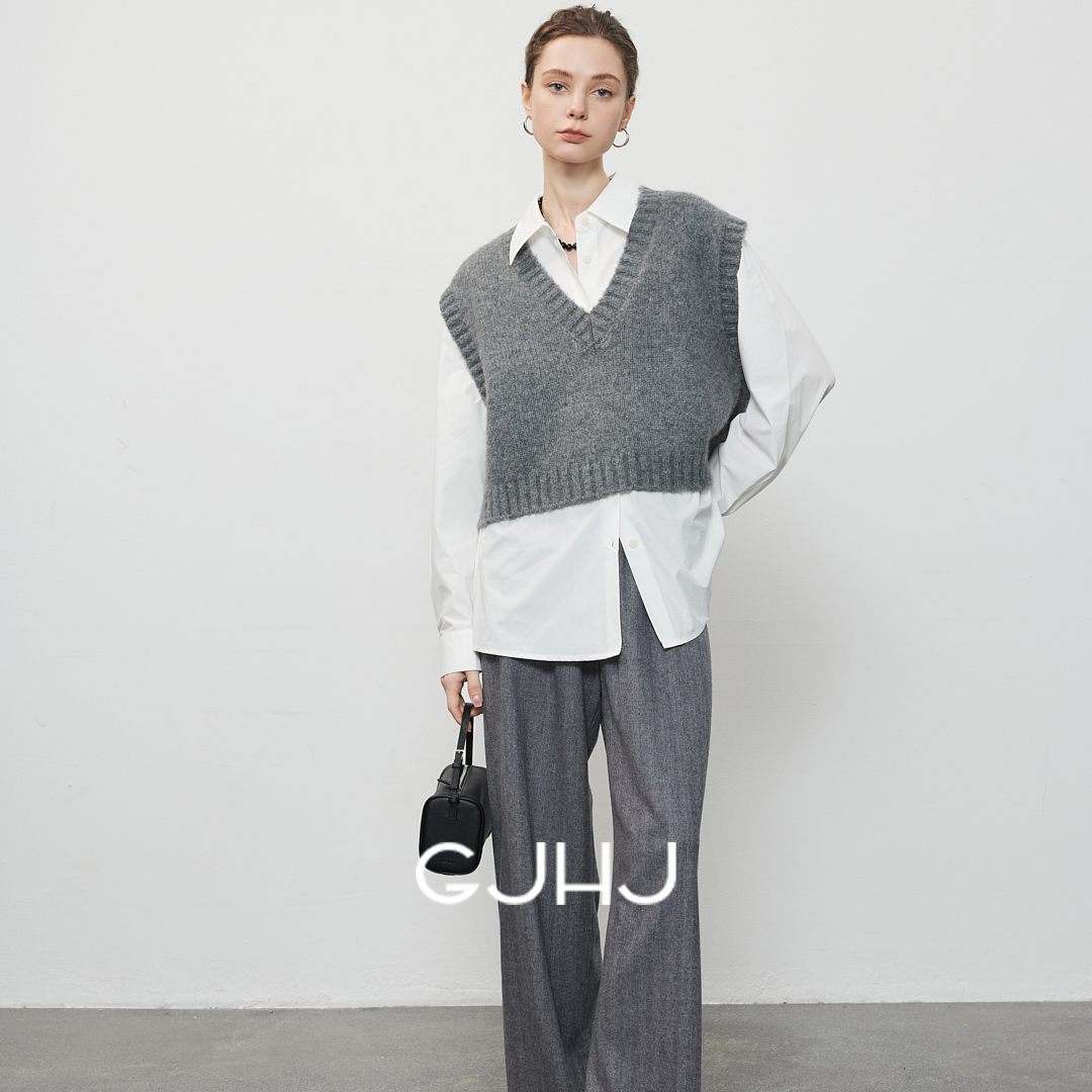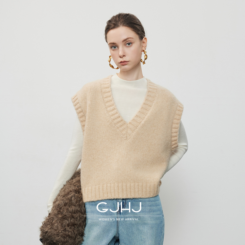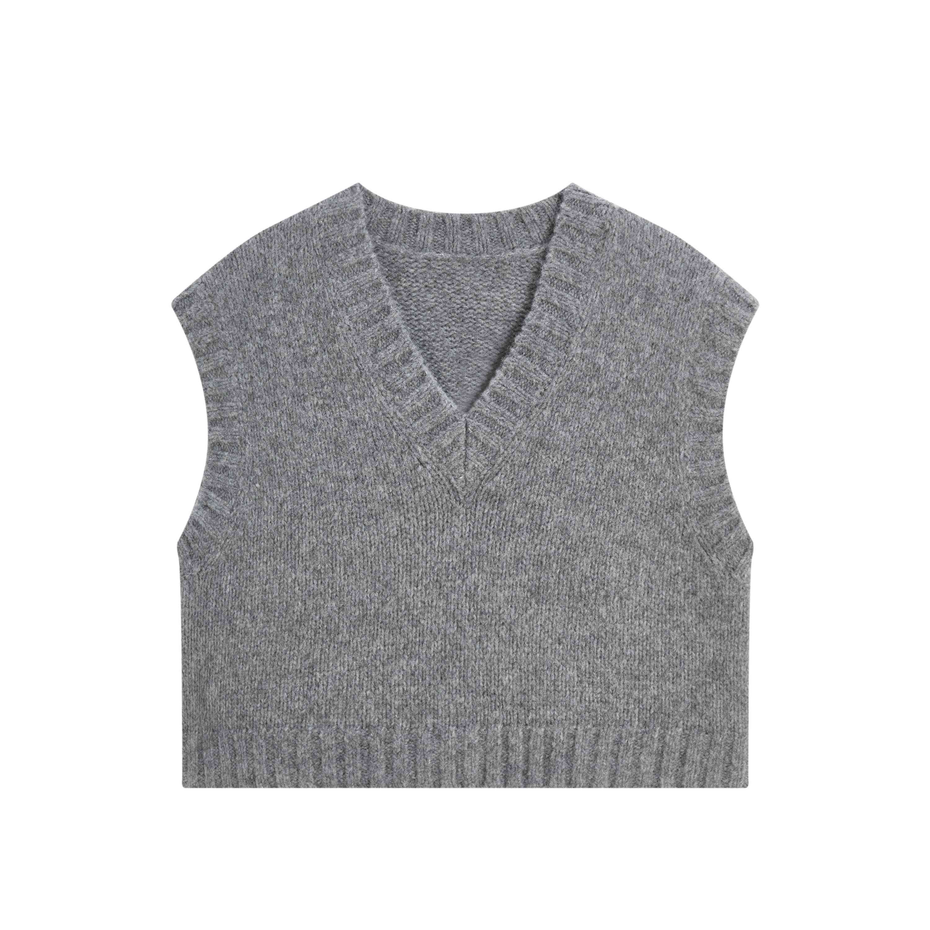gjhj叠穿灰色羊毛混纺 纯色复古V领针织马甲短款羊毛背心女秋冬