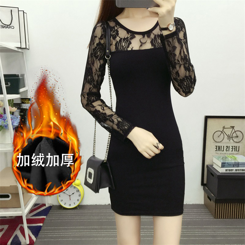 秋季新款性感黑色蕾丝连衣裙女修身中长款网纱拼接包臀长袖打底衫