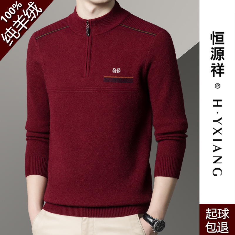 恒源祥100%纯羊绒衫男士拉链半高领毛衣中老年加厚保暖羊毛针织衫