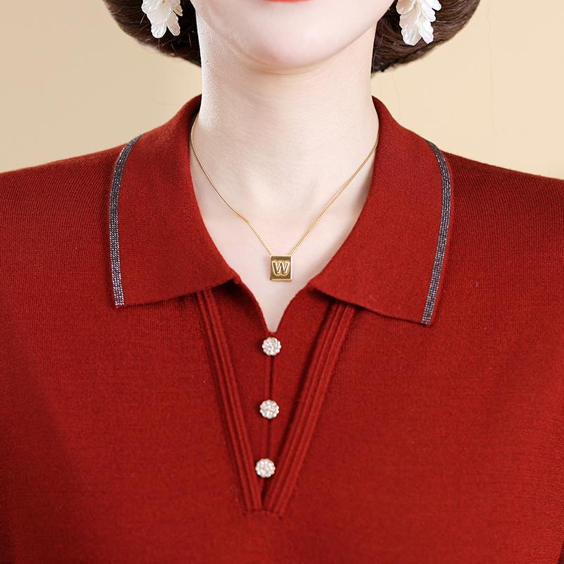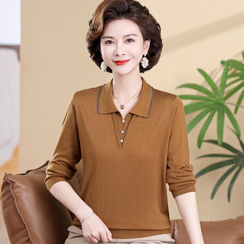 妈妈春装长袖T恤2025新款中年妇女翻领打底衫中老年人黑色针织衫