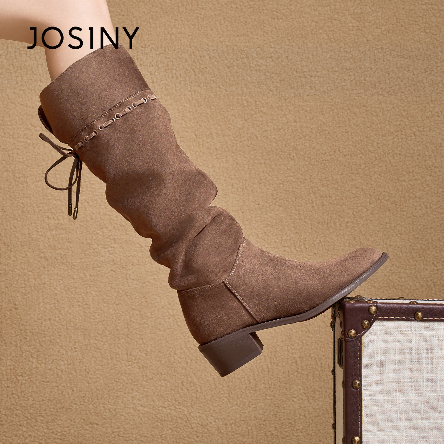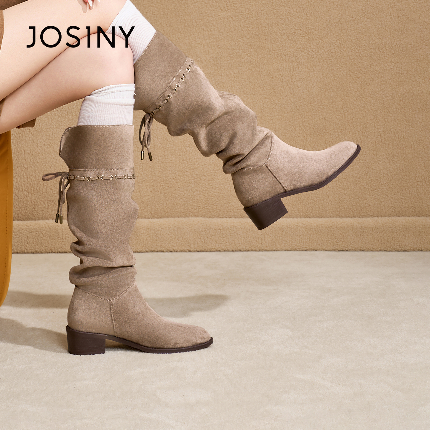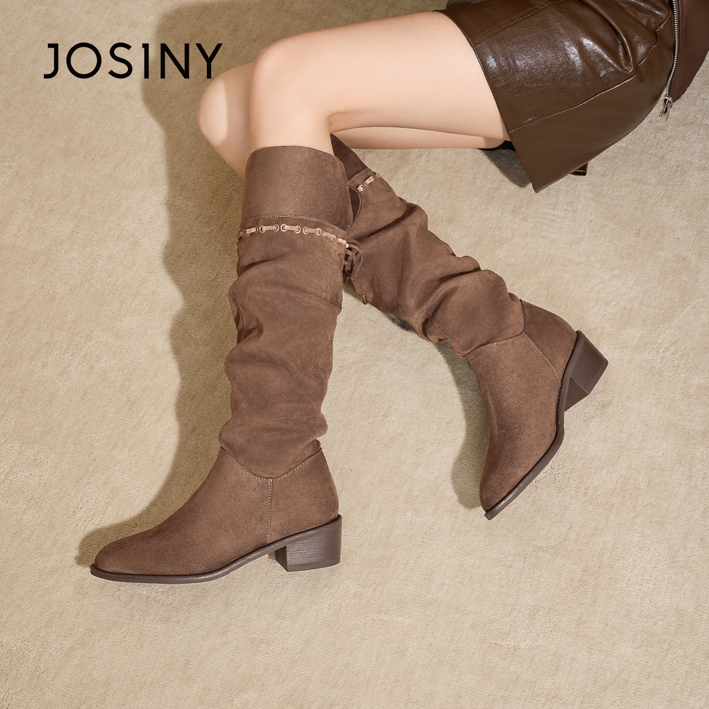 卓诗尼冬季25新款长筒靴女尖头显瘦褶皱堆堆小个子铆钉细跟骑士靴