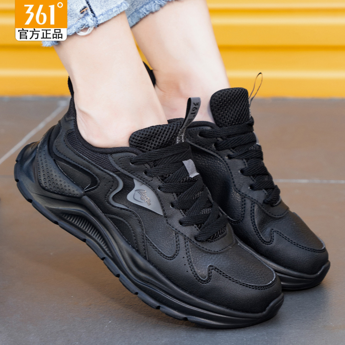 361运动鞋女跑鞋皮面防水鞋子361度女鞋休闲跑步鞋秋冬黑色通勤鞋