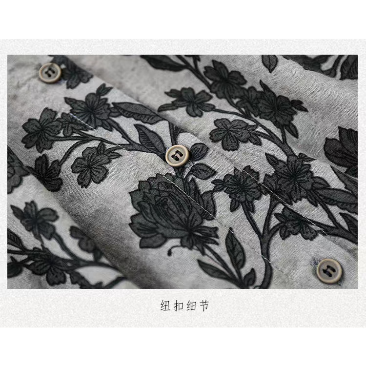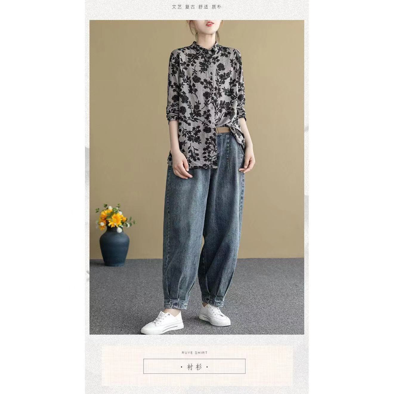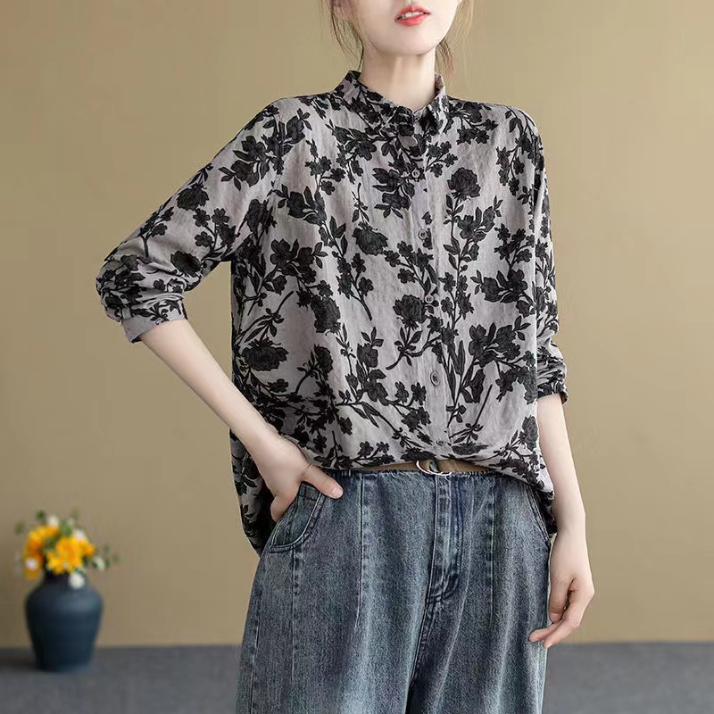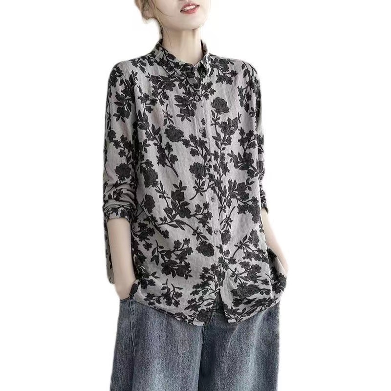 春款复古碎花棉麻长袖方领花衬衫女上装宽松百搭显瘦衬衣开衫印花
