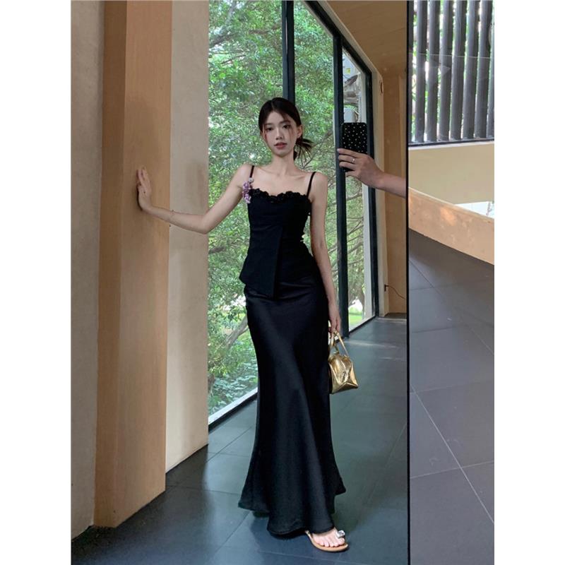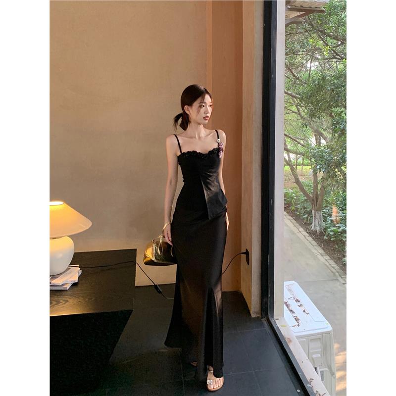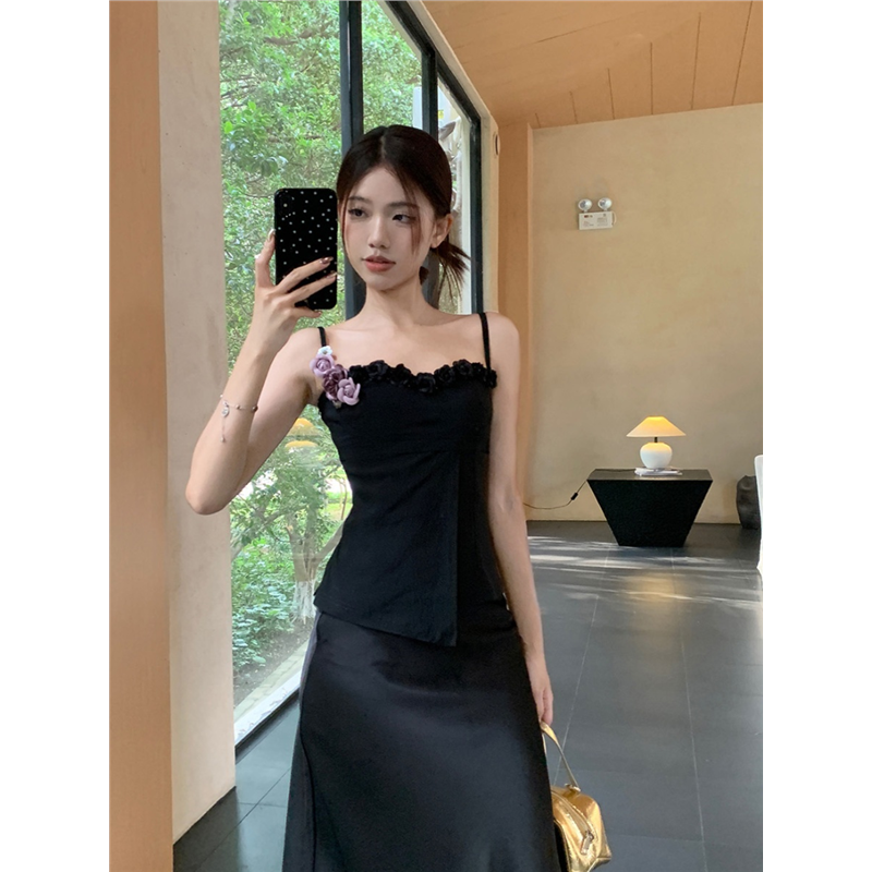 立体玫瑰花吊带背心上衣套装裙夏季高级感垂感缎面半身裙两件套女