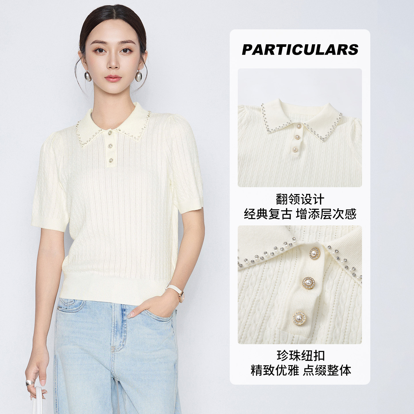 马天奴2025夏季新款纯色提花针织上衣钉珠翻领短袖T恤时尚百搭女