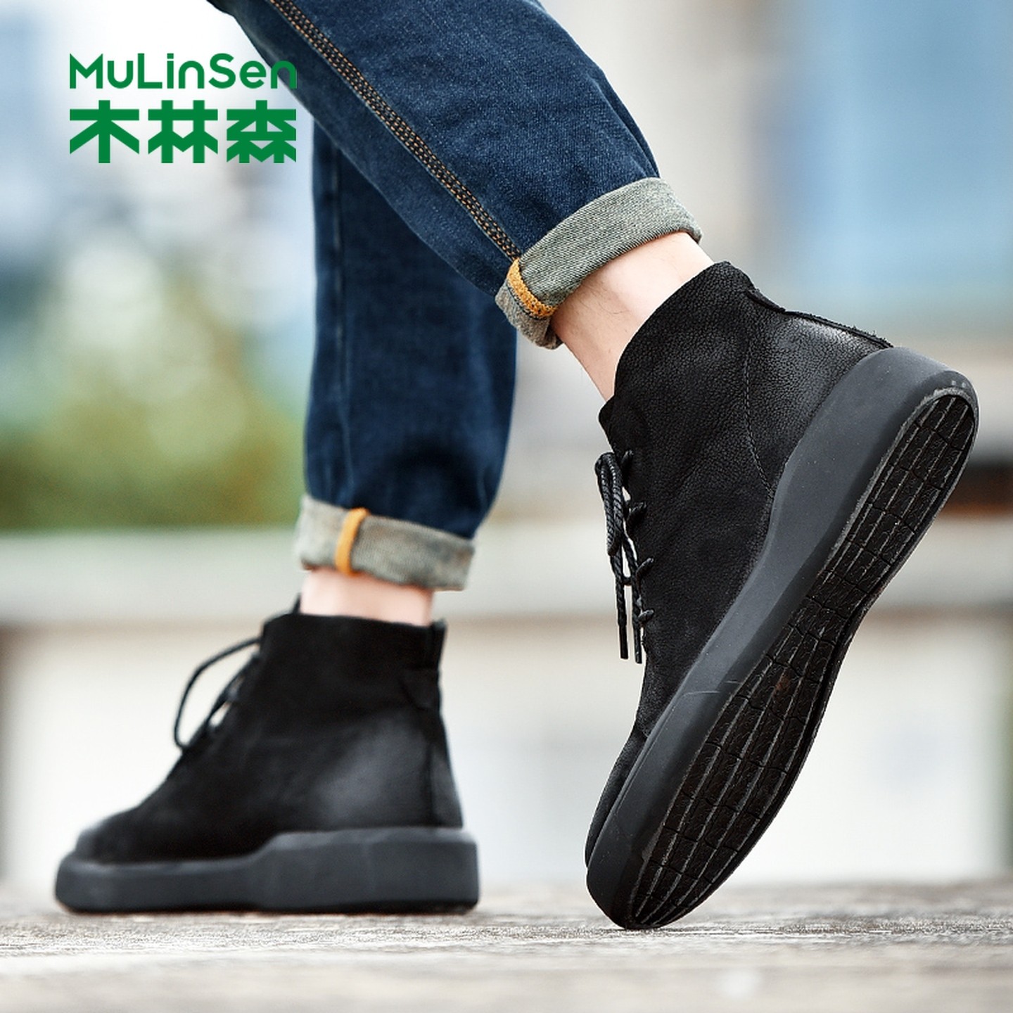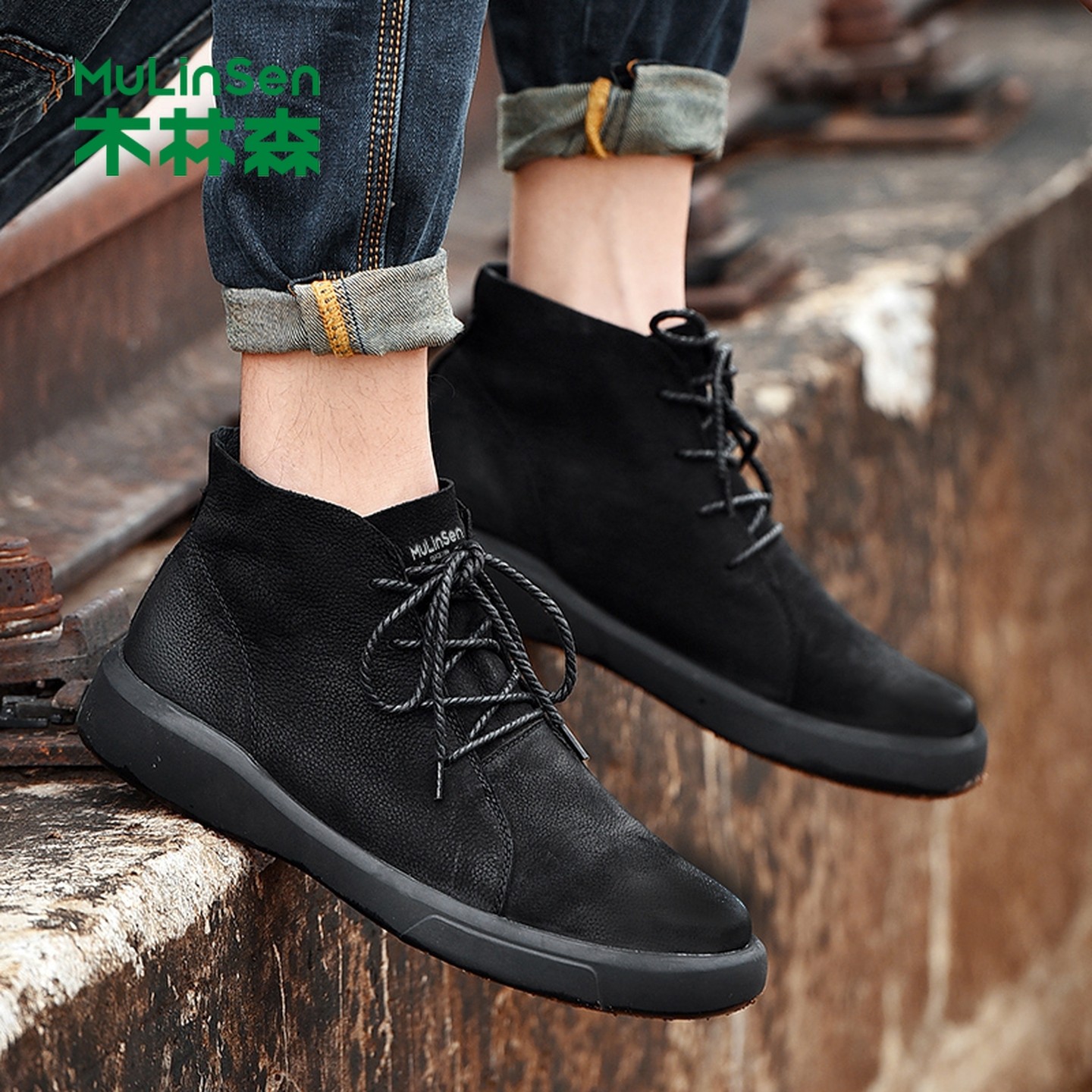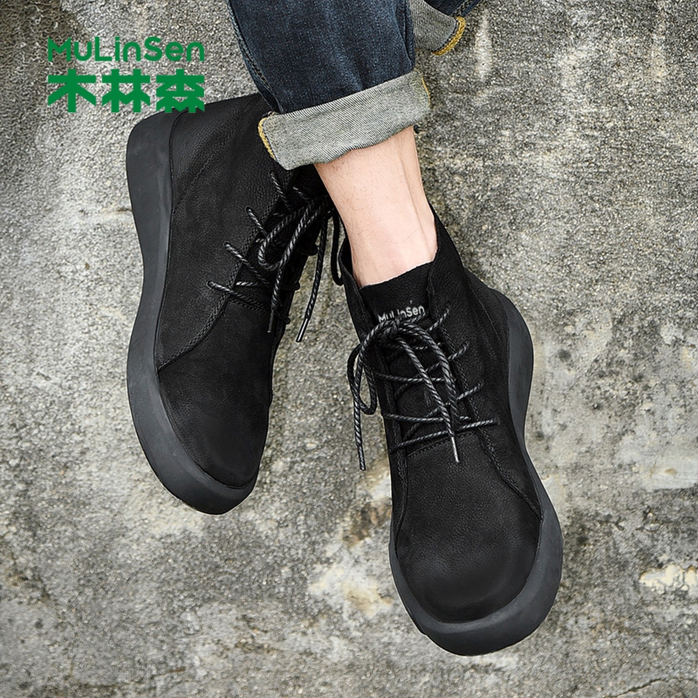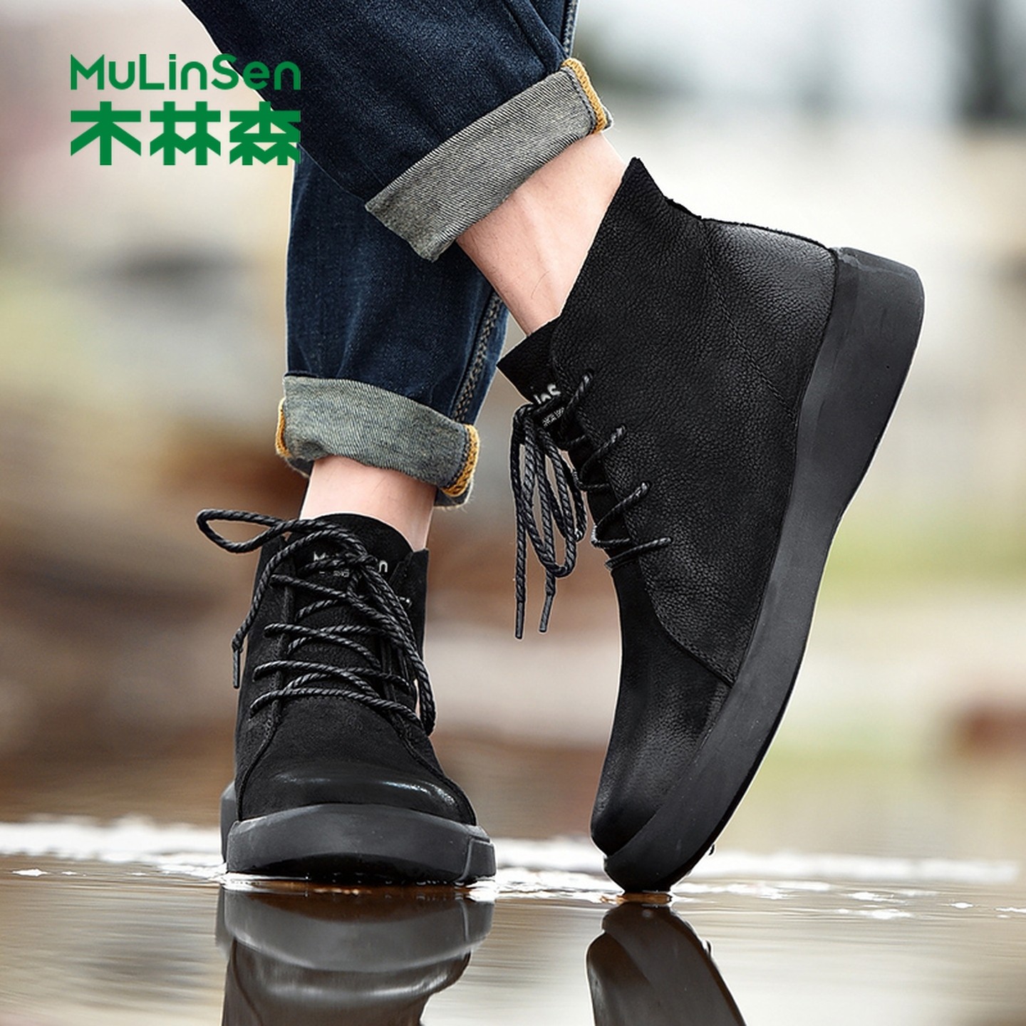 木林森男鞋真皮马丁靴秋冬加绒皮鞋保暖短靴系带工装靴男靴大头鞋