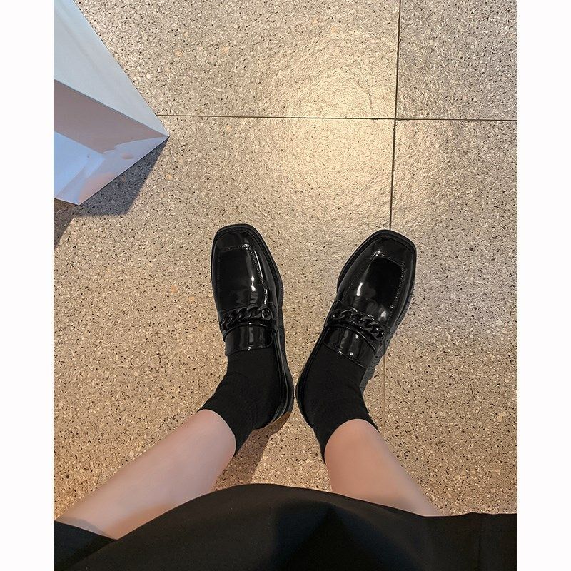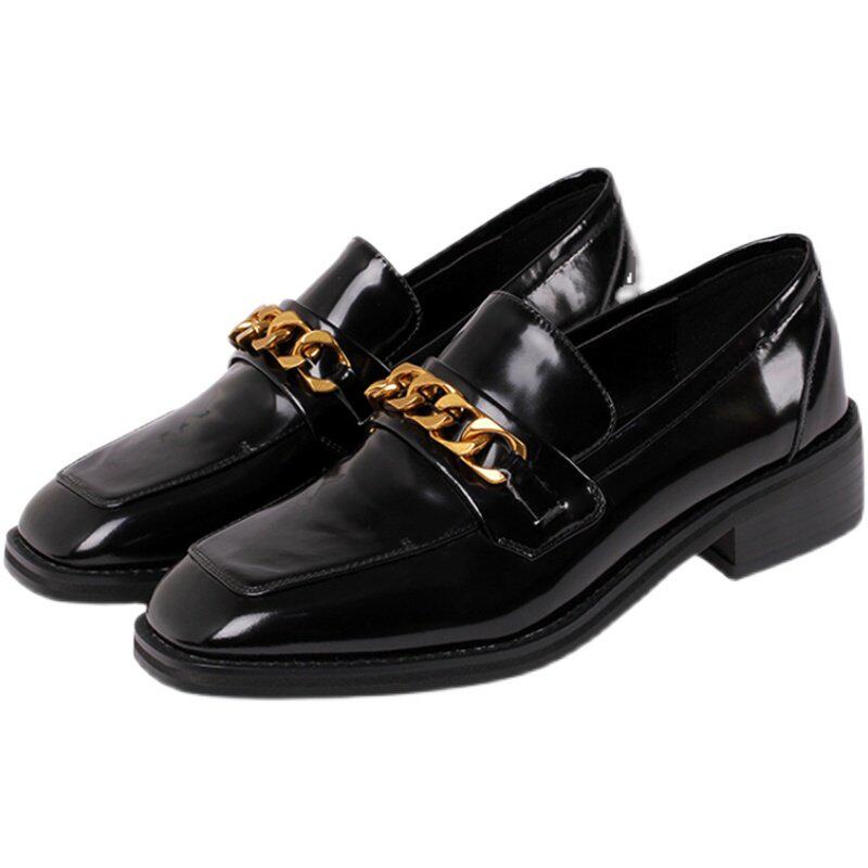 2026春季新款方头中跟单鞋金属链条英伦小皮鞋女粗跟jk复古乐福鞋