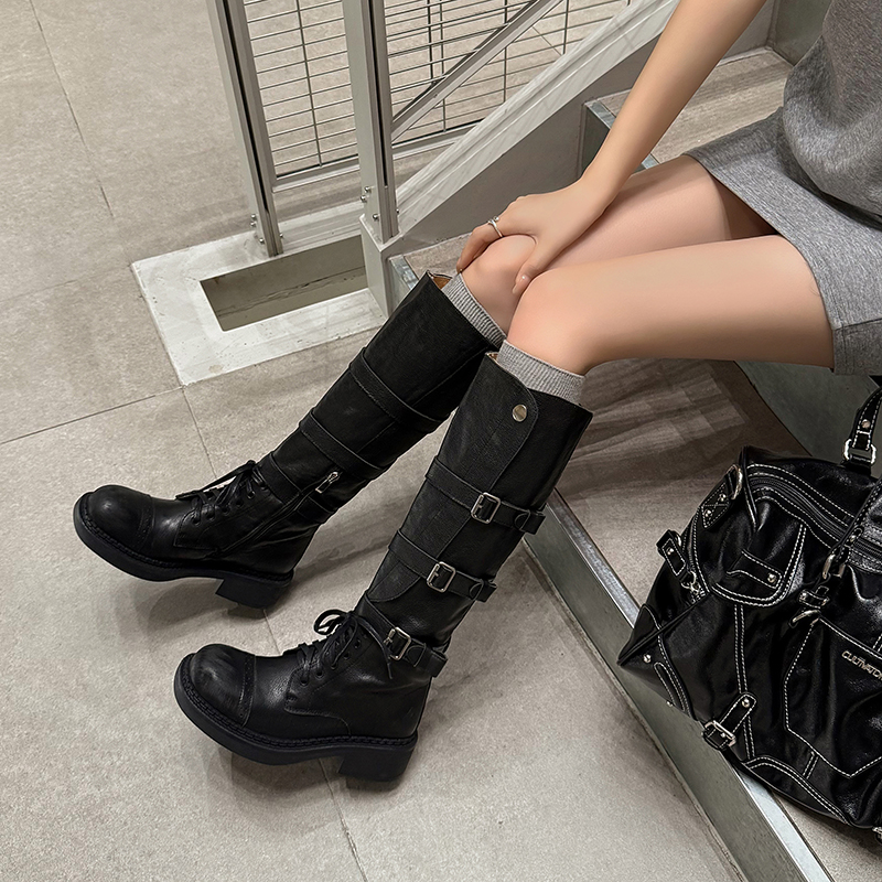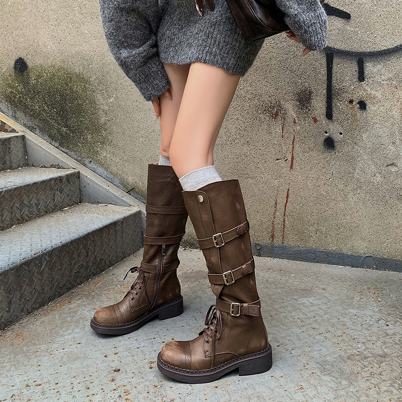 4cm复古系带高筒骑士靴女秋冬新款英伦真皮粗跟扣带不过膝长筒靴