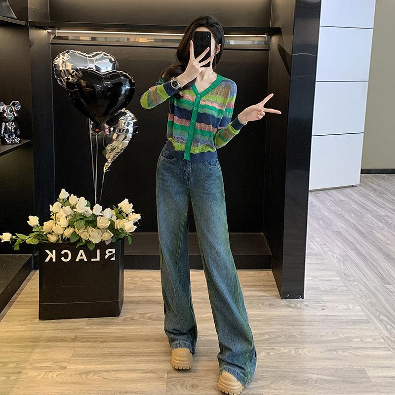春季条纹撞色领新款女休闲2025牛仔裤开衫套装时尚V高腰直筒