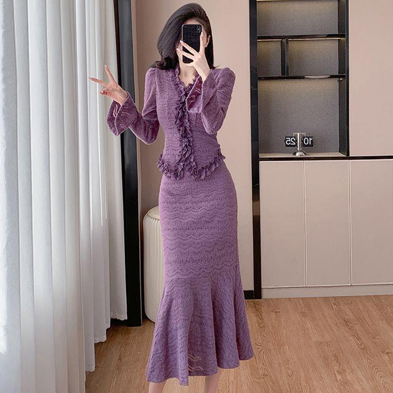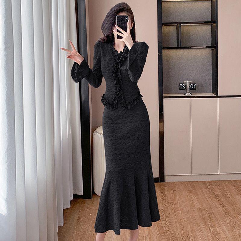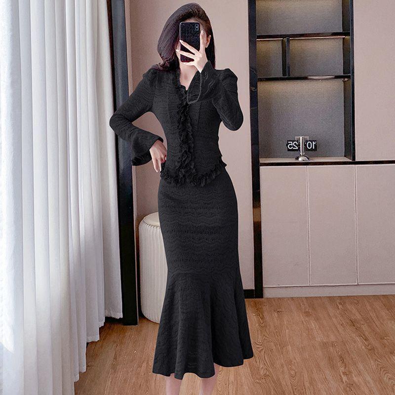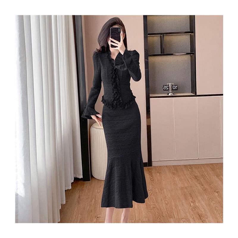 2025秋季新款法式小香风木耳边蕾丝上衣鱼尾半身裙两件套连衣裙女