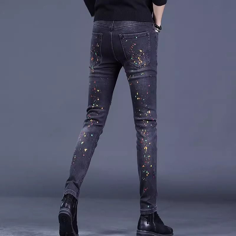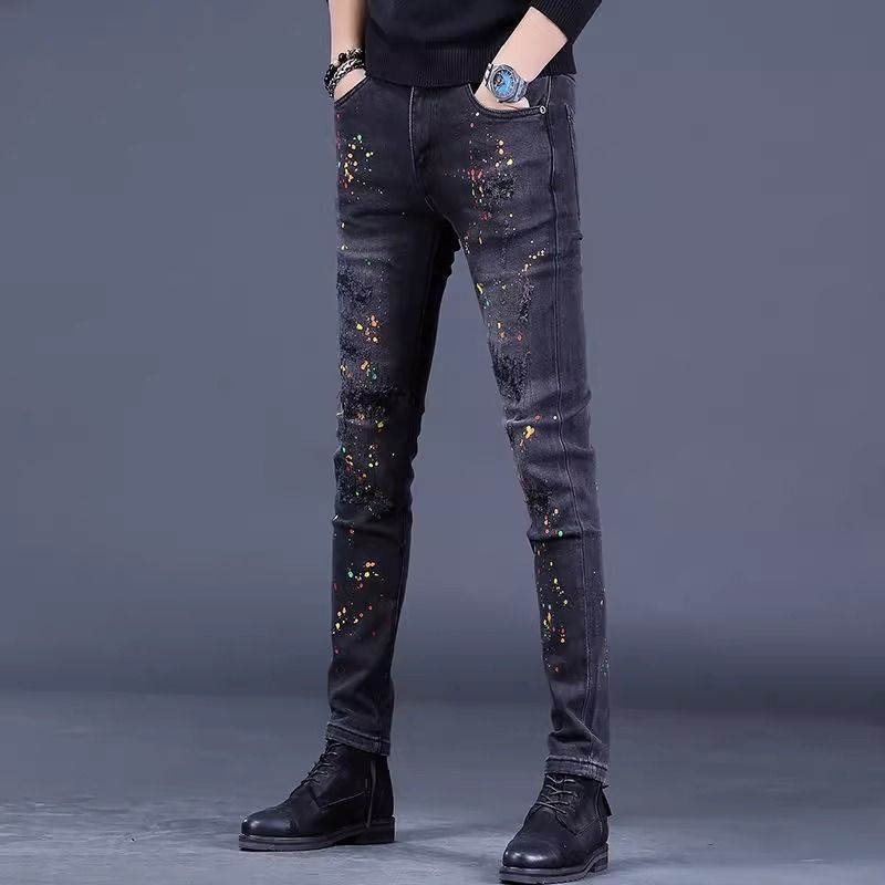 2025潮牌嘻哈泼墨牛仔裤男修身小脚秋季韩版潮流破洞补丁裤子男士