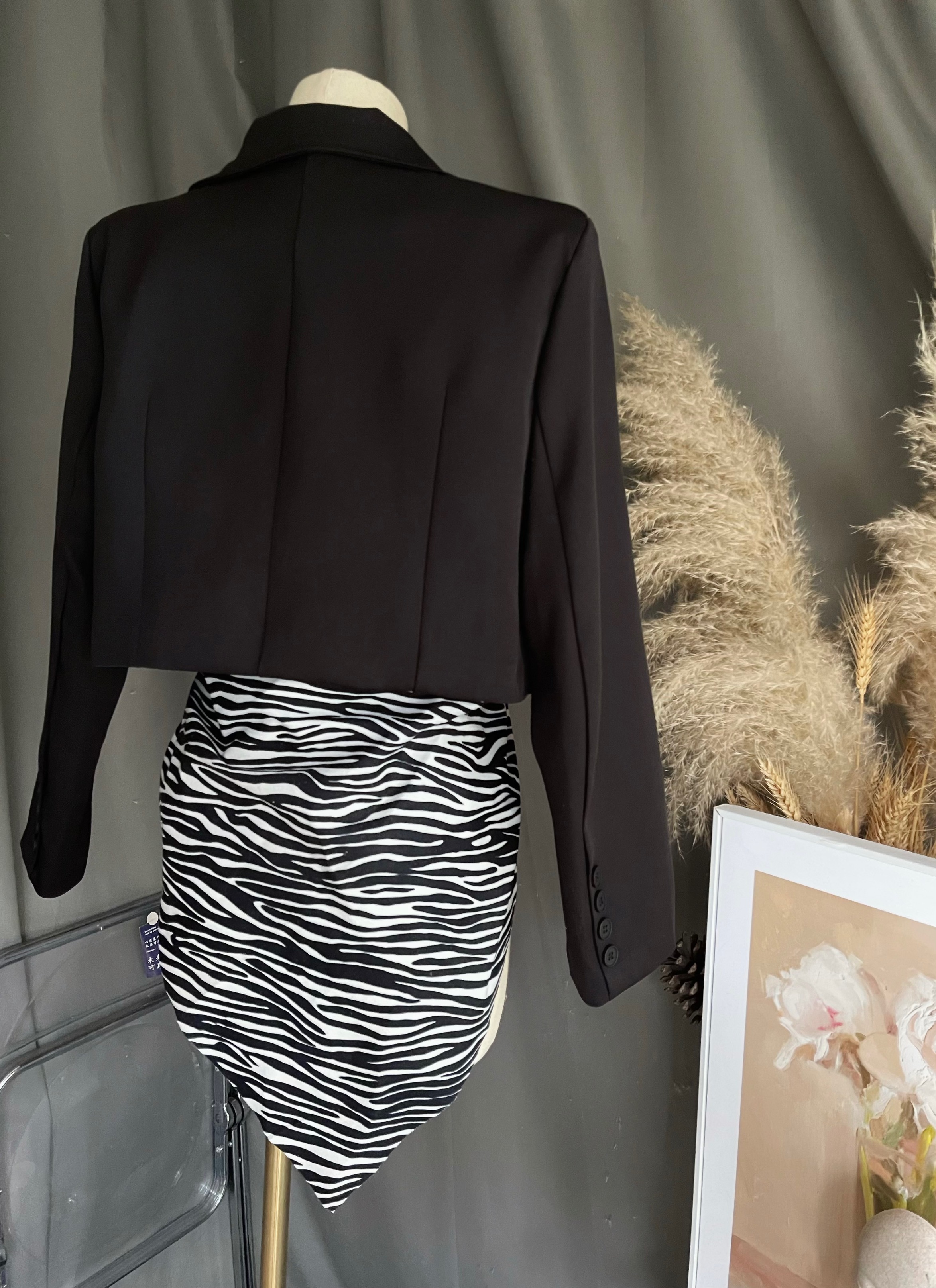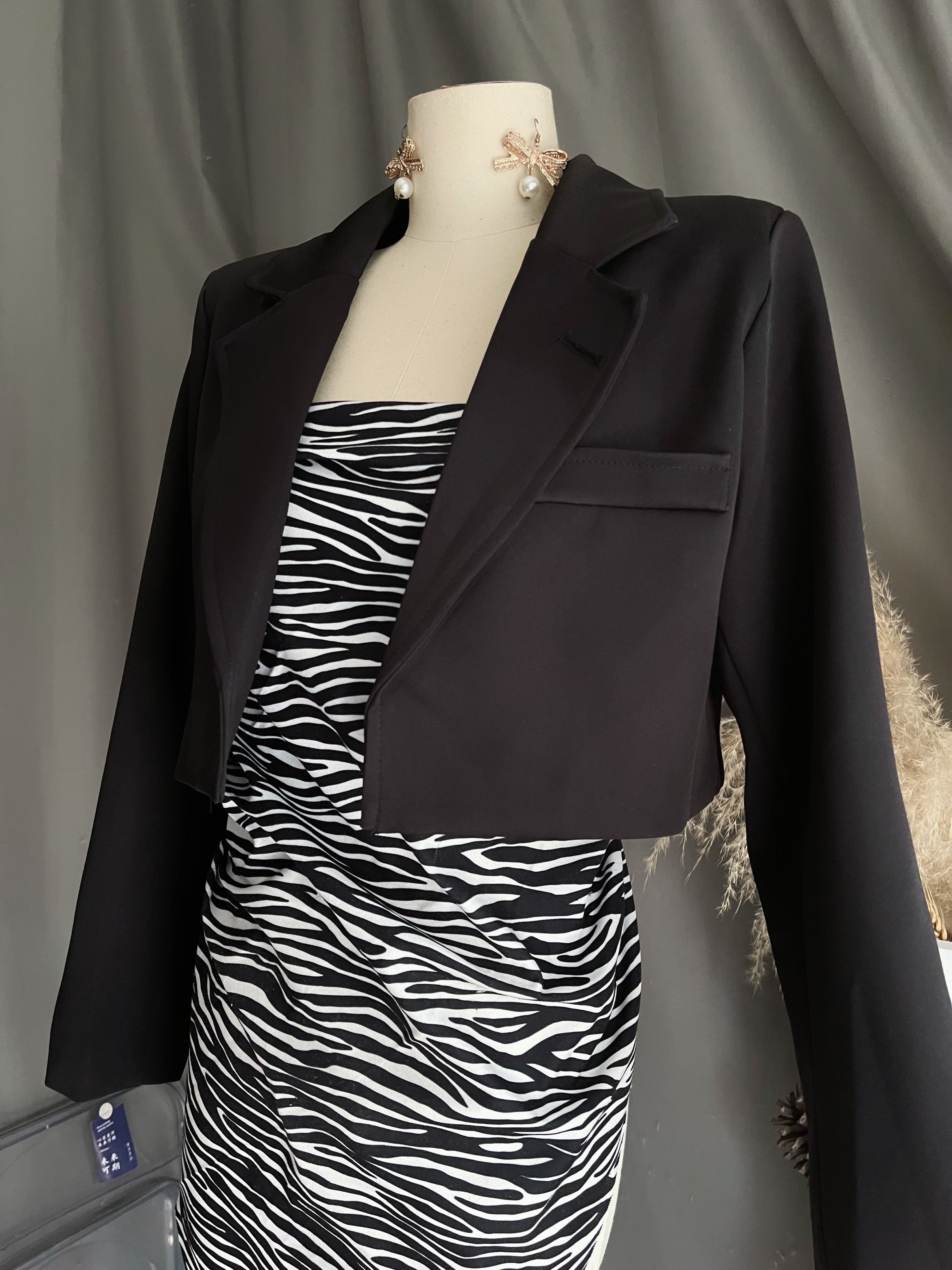 原创现货 时髦黑色垫肩短款西装外套小众设计感小个子上衣套装女