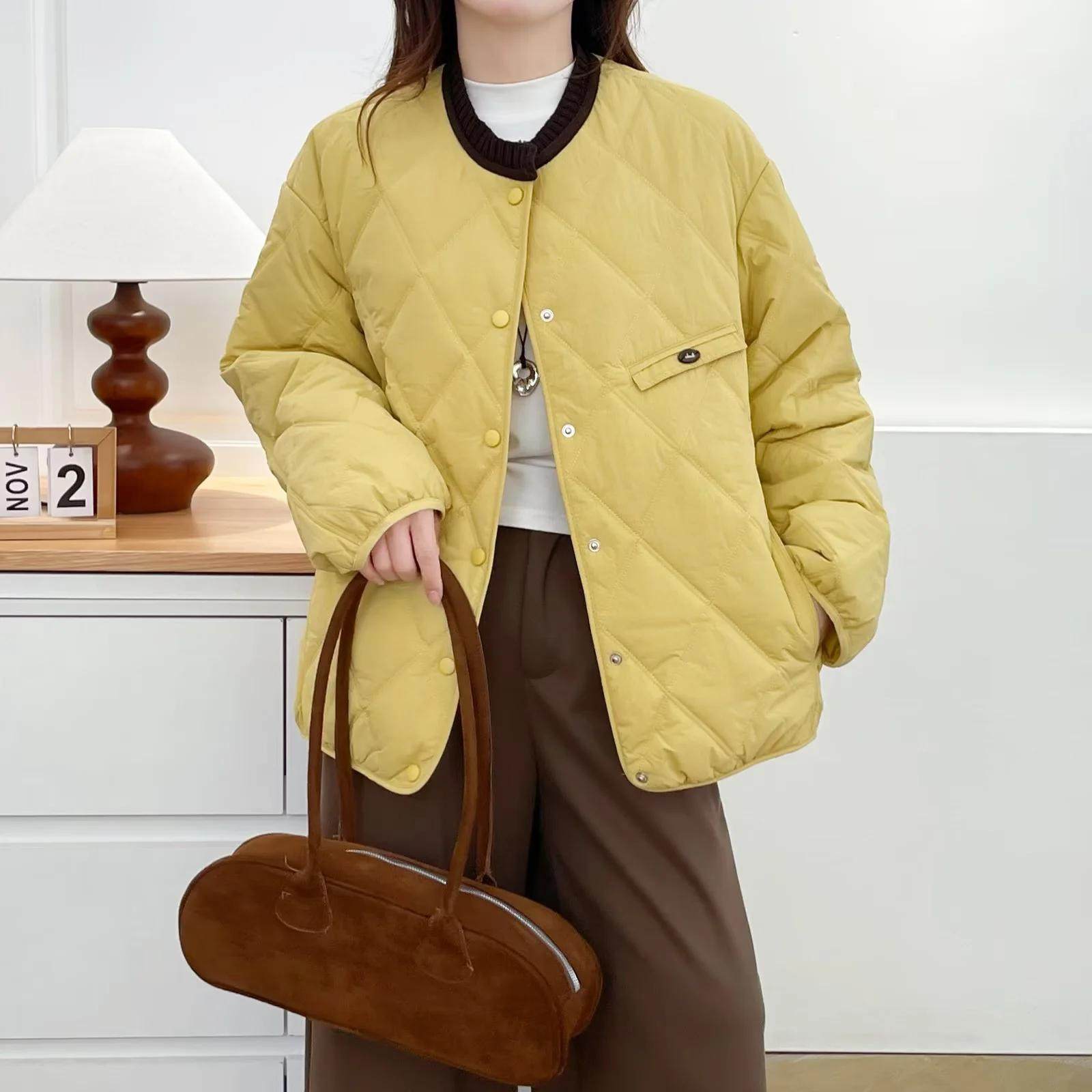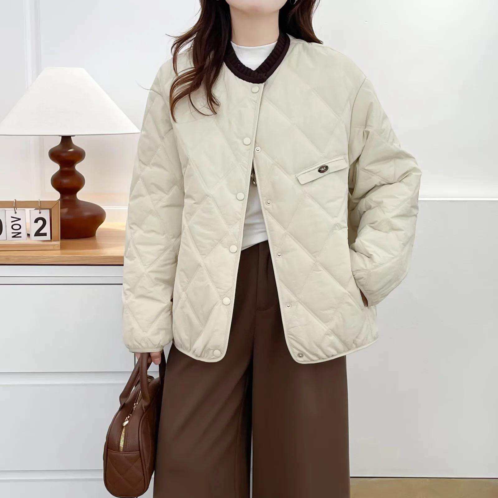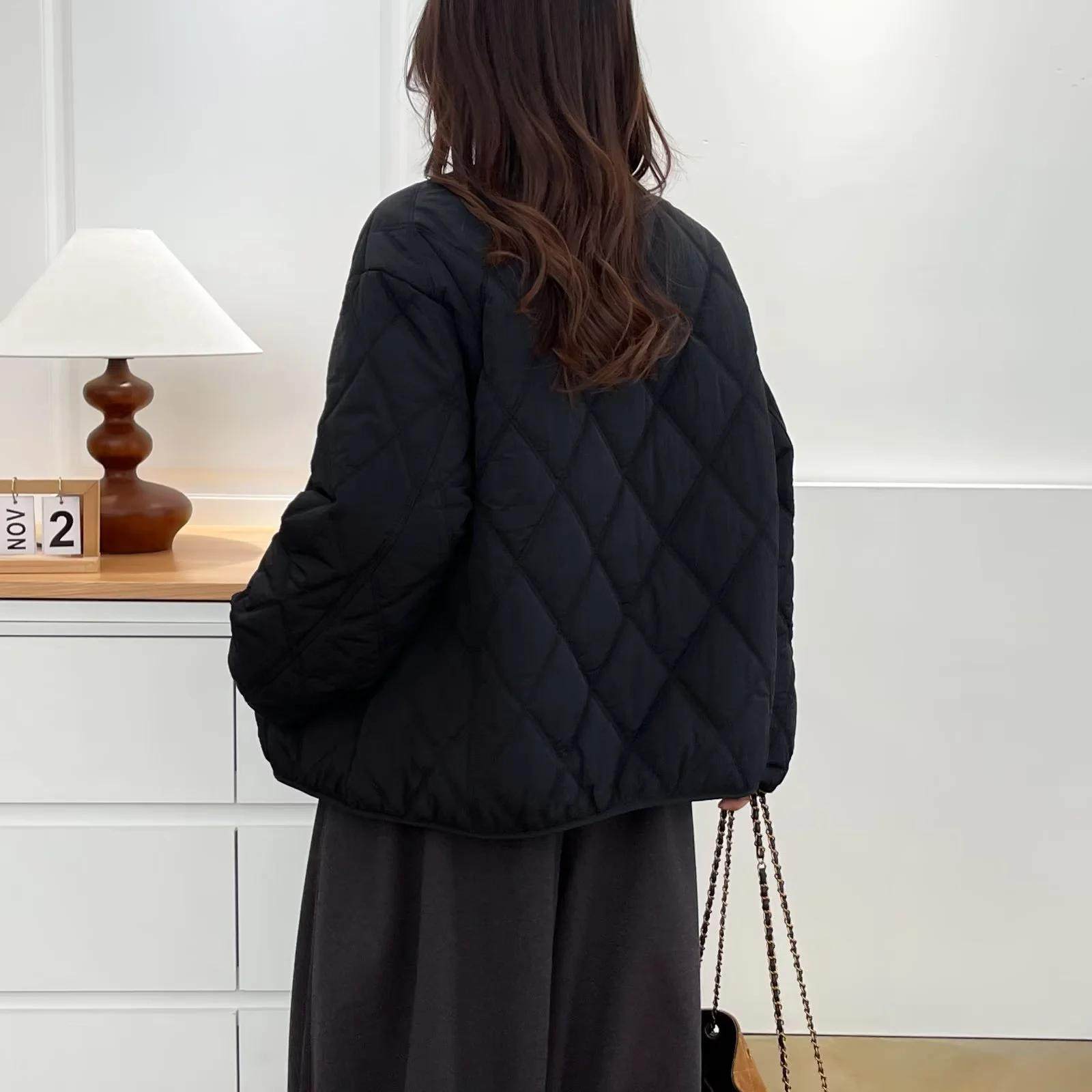 圆领领子撞色厚款菱格长袖棉服