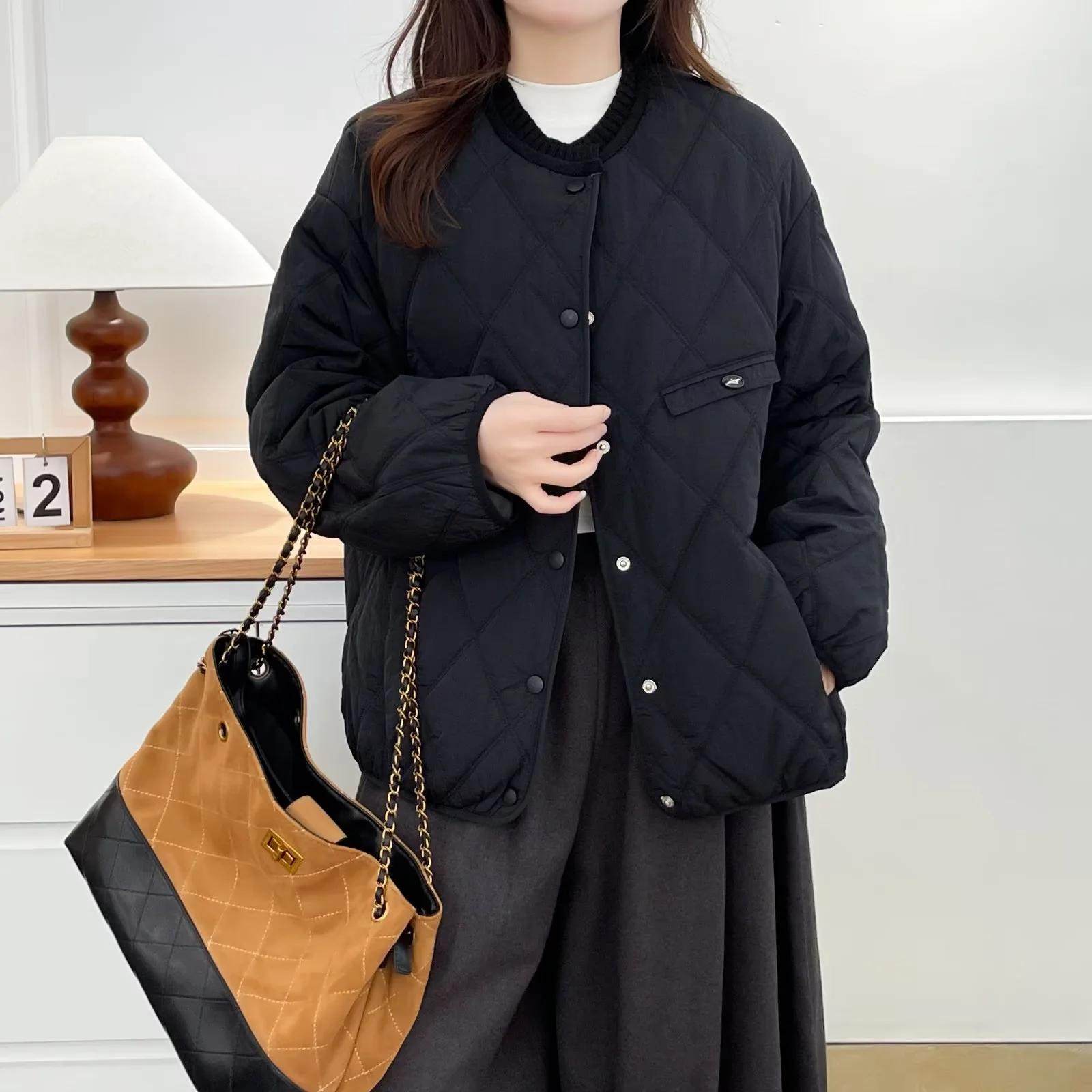 2025女装冬装胖mm女棉袄中年大码圆领领子撞色厚款菱格长袖棉服