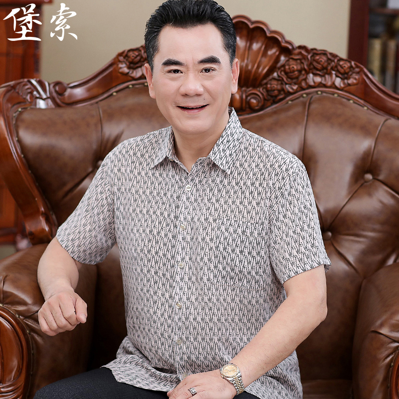 堡索中老年男装真丝双绉短袖衬衣男桑蚕丝夏装中年衬衫透气爸爸装