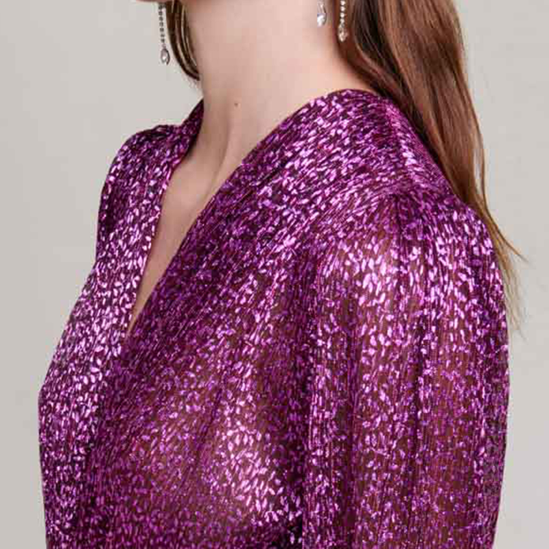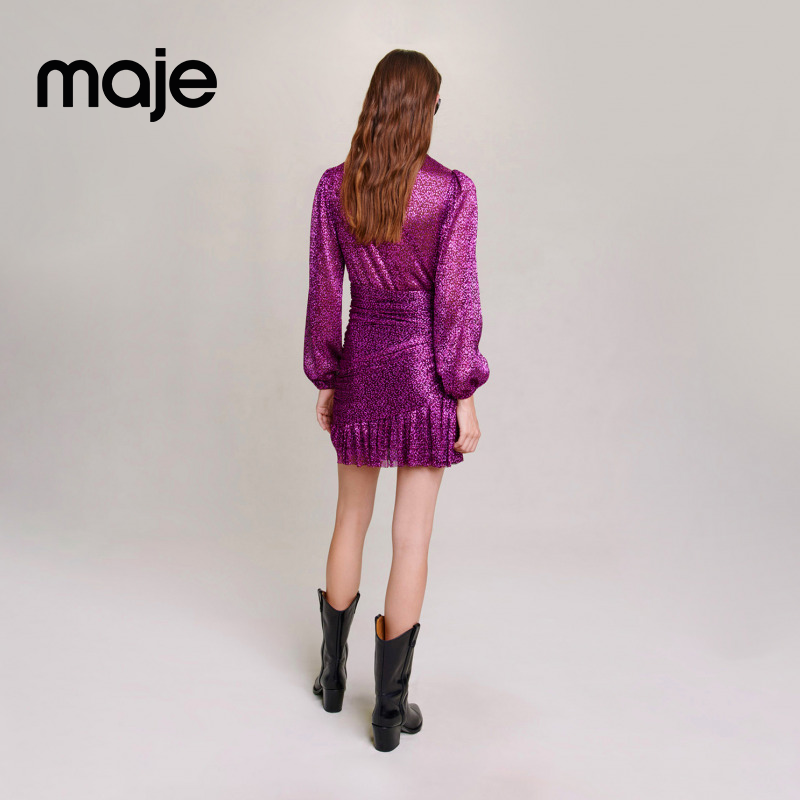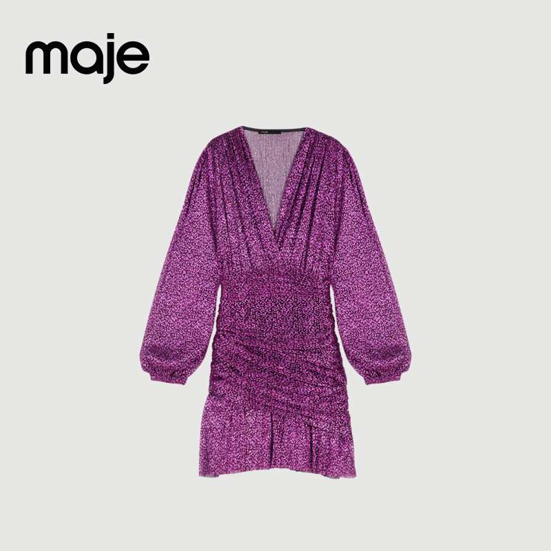 Maje Outlets秋冬女装性感修身光泽褶皱面料深V领A字百褶连衣裙