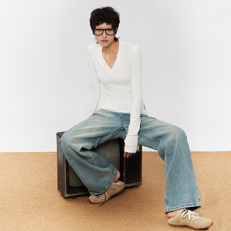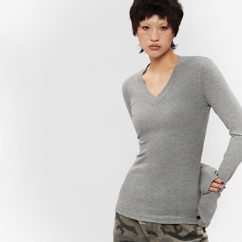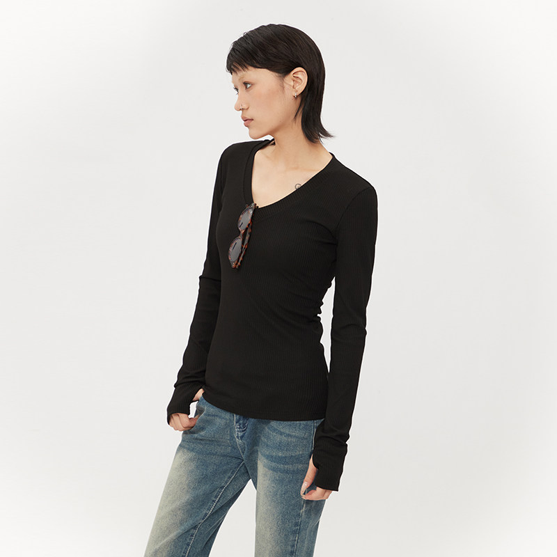AIRHOOD 美式长袖紧身打底衫女春秋季白色V领修身t恤韩系内搭上衣