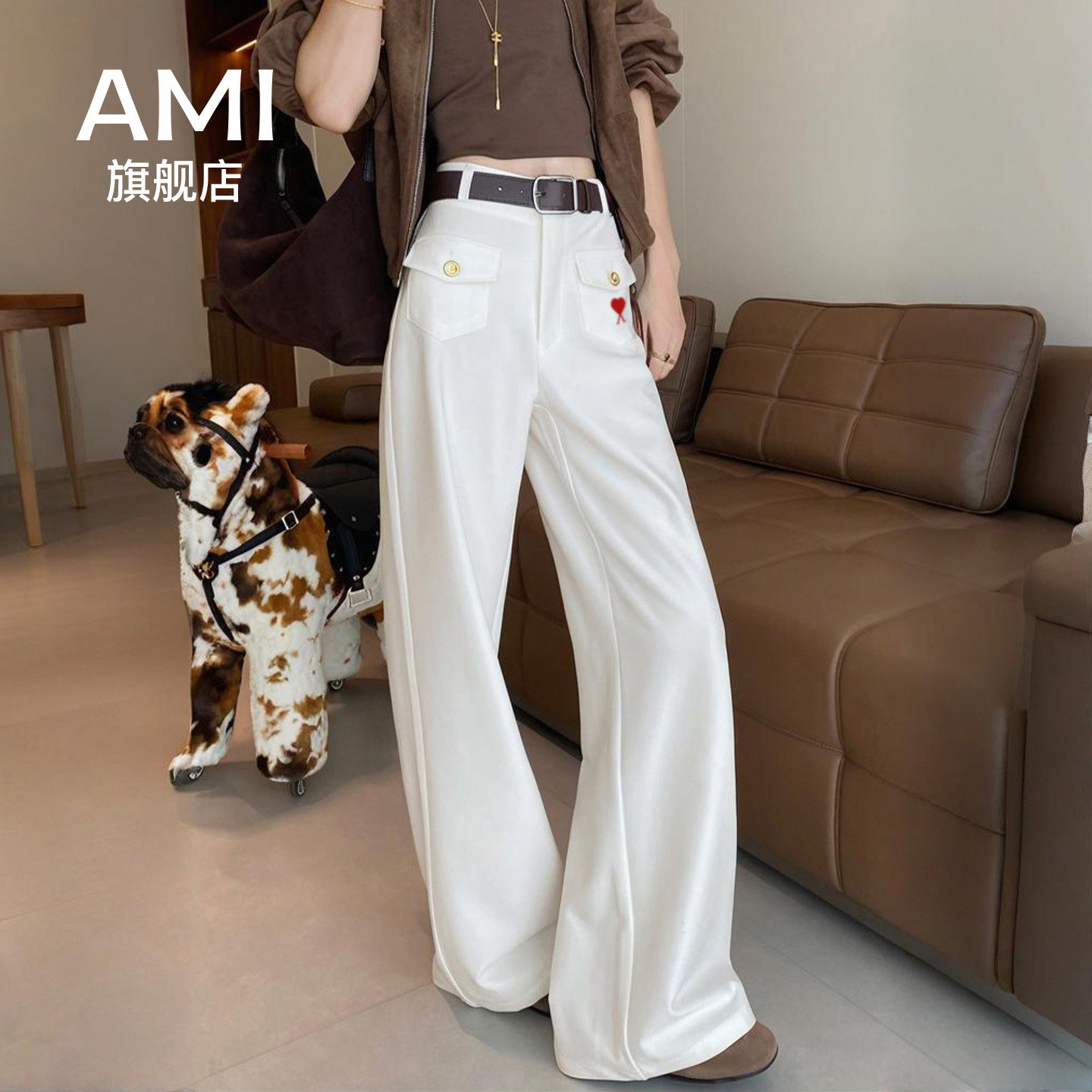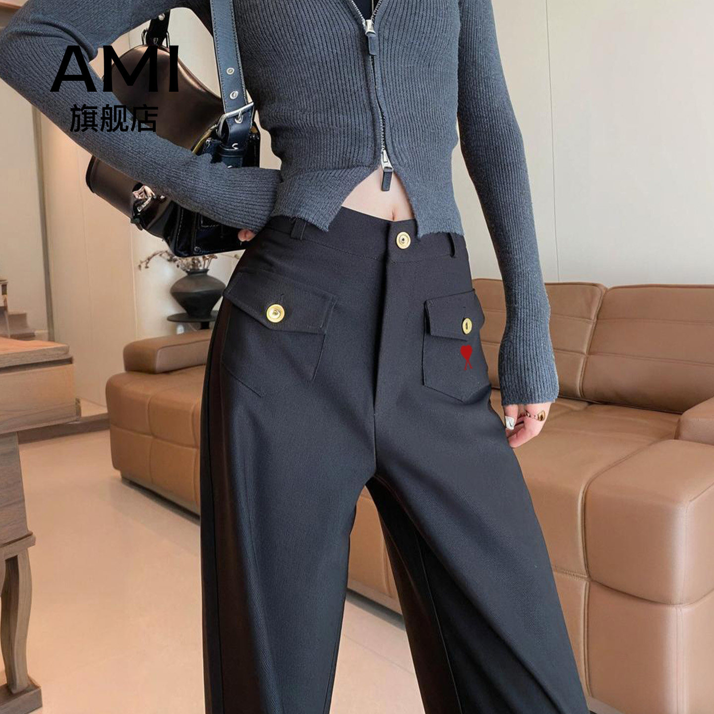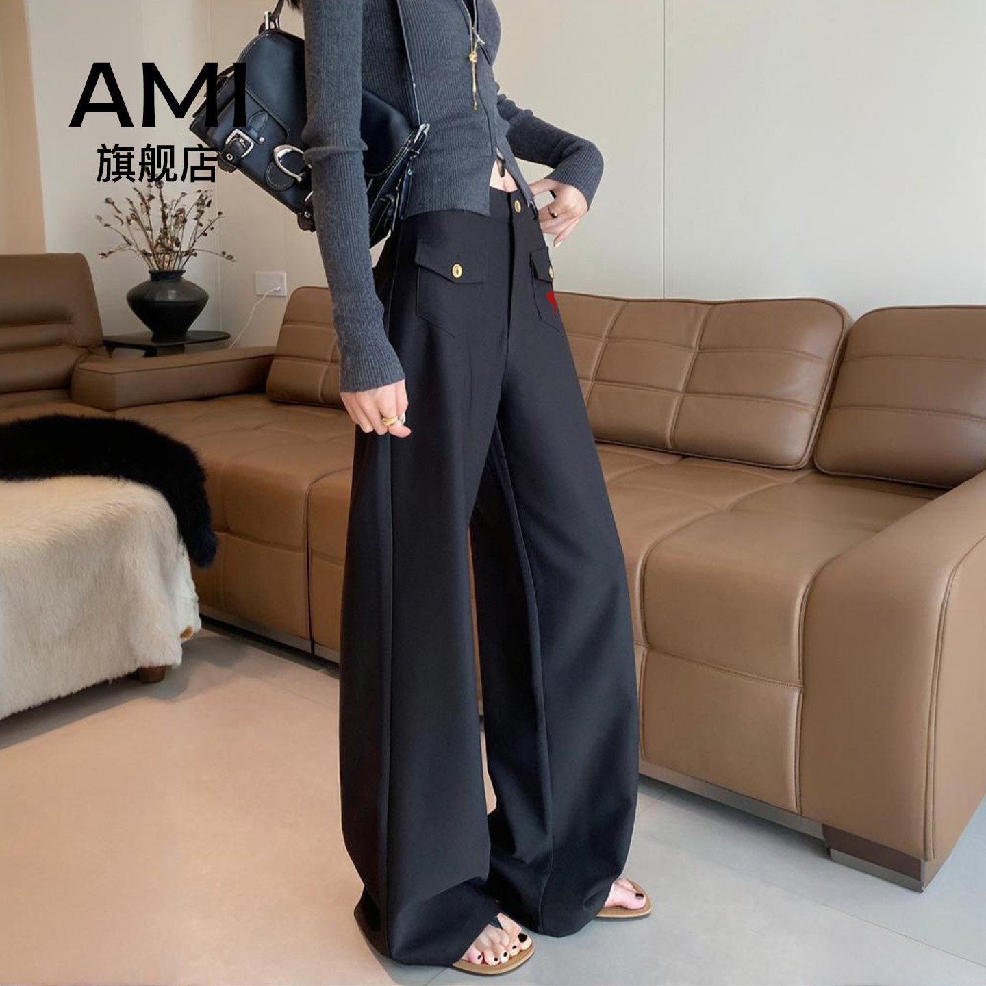 AMI官方阔腿裤女春新款高腰垂感窄版西装裤直筒慵懒松弛感裤子