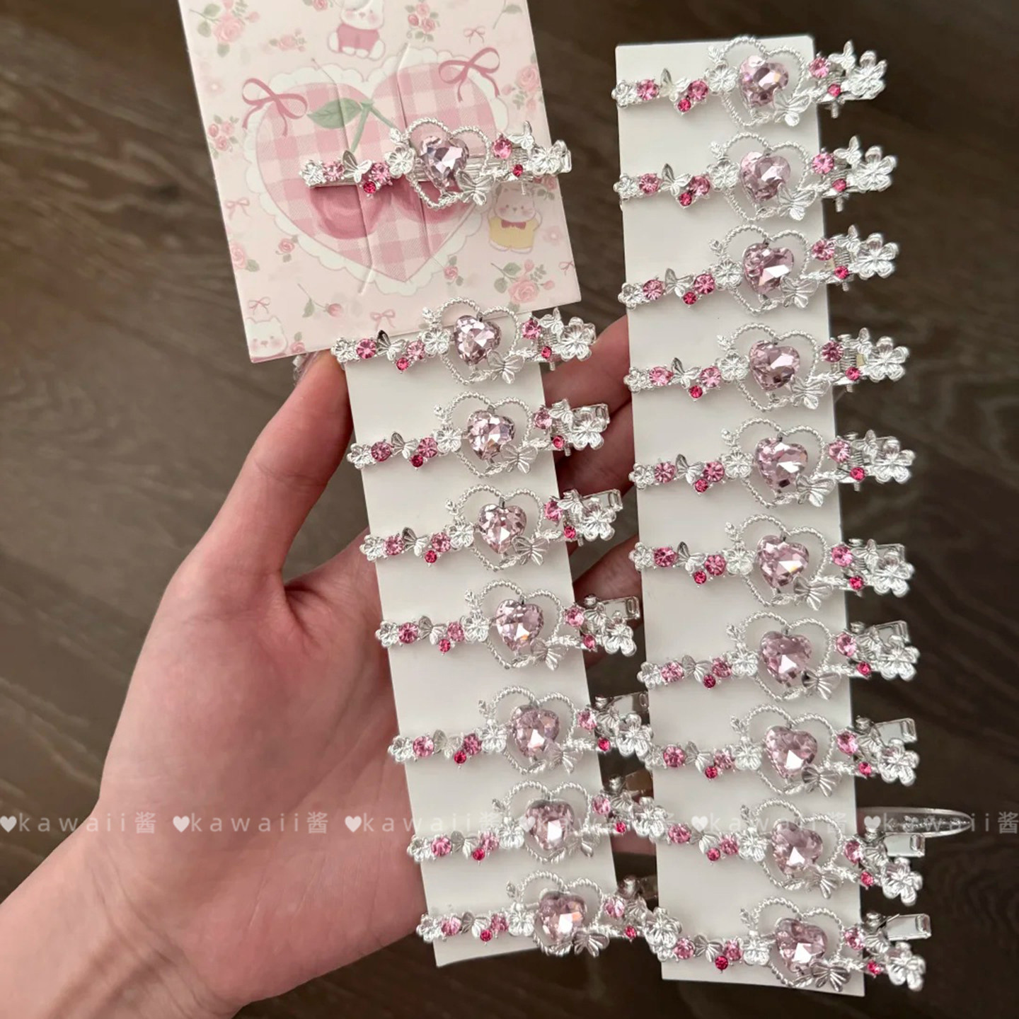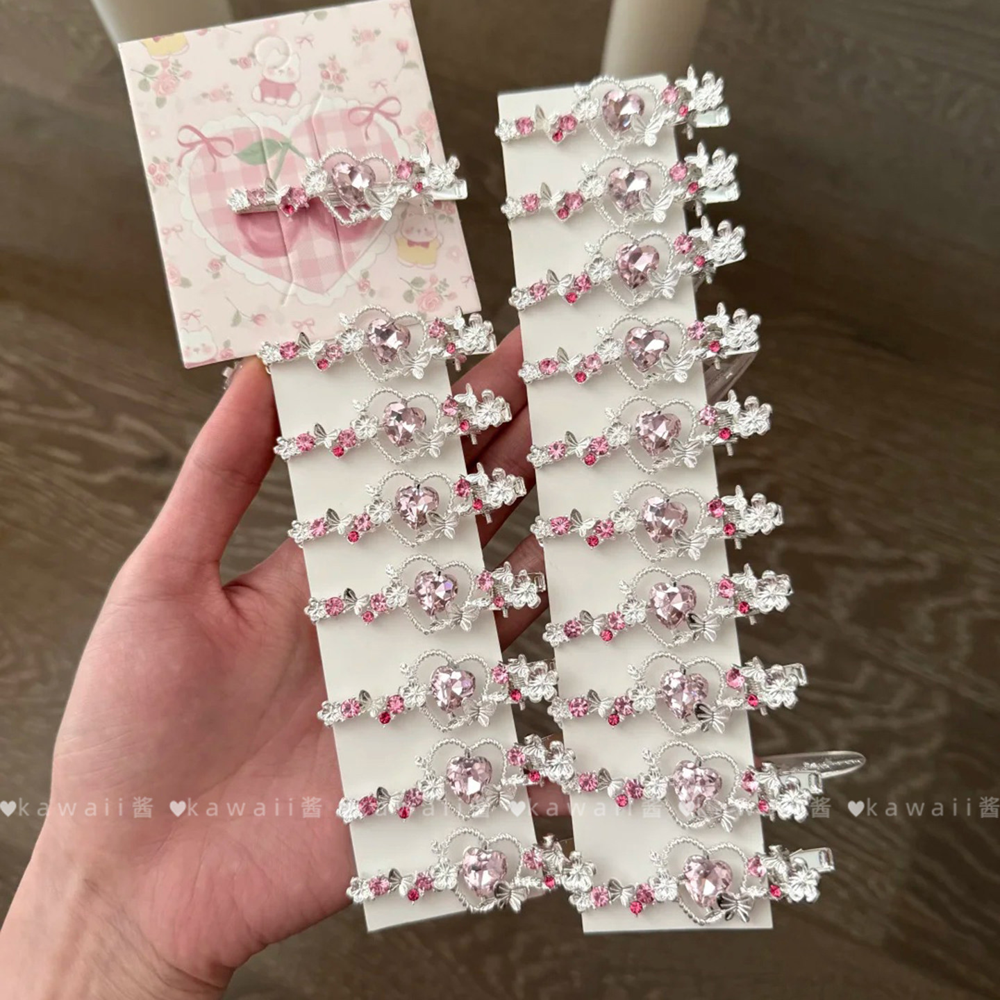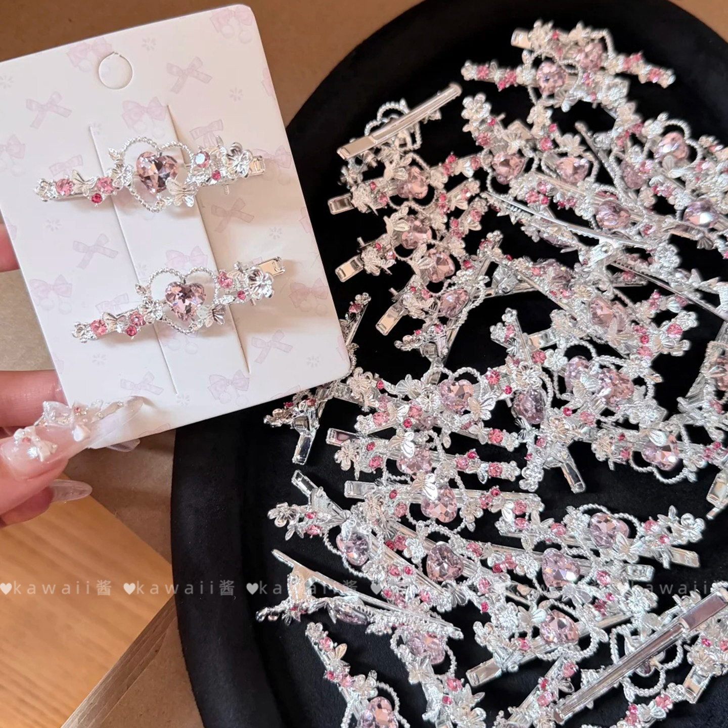 甜美少女风粉色爱心水钻发夹