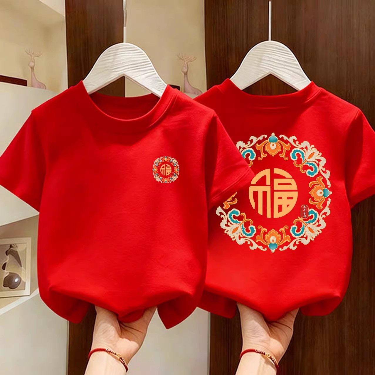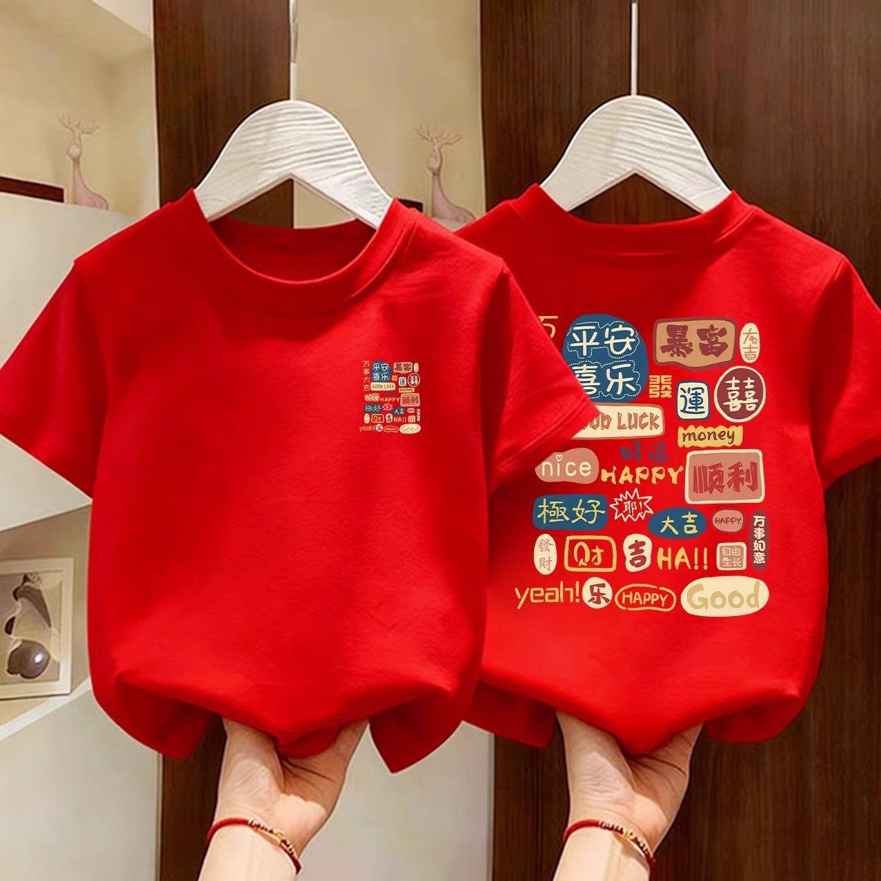 100%纯棉儿童短袖t恤2026马年红色本命年男童女童打底上衣服装夏