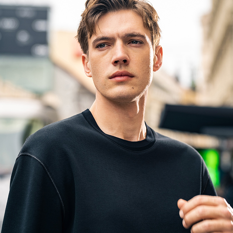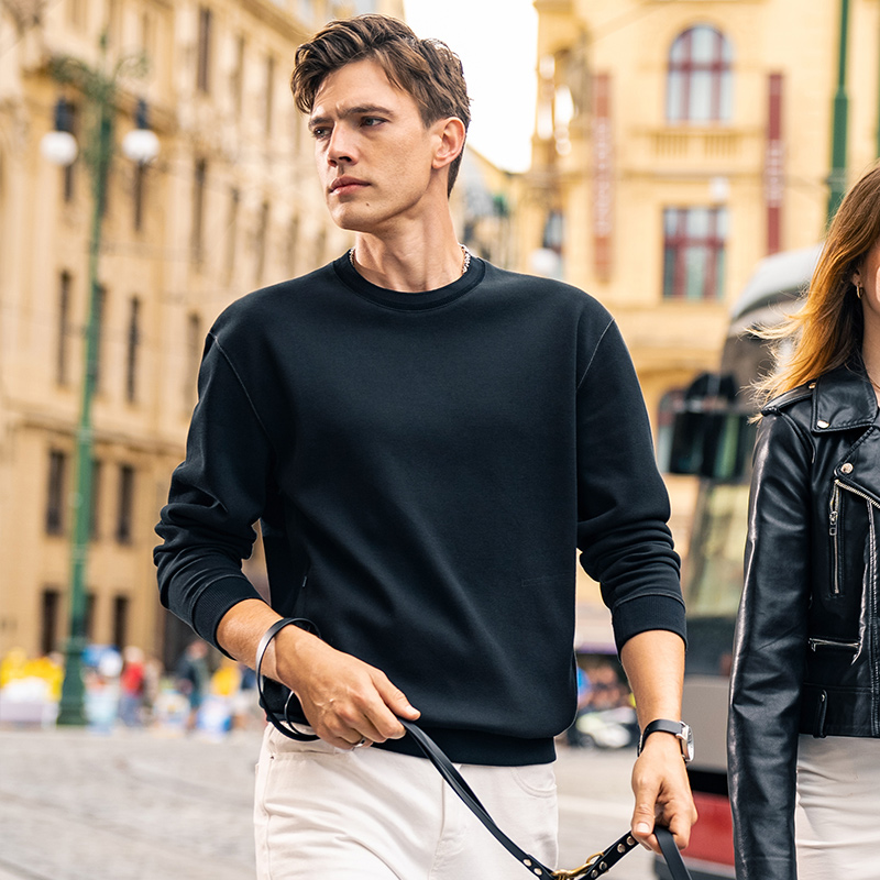 MrBu布先生微廓黑色圆领落肩袖卫衣隐形拉链口袋长袖男PT15522