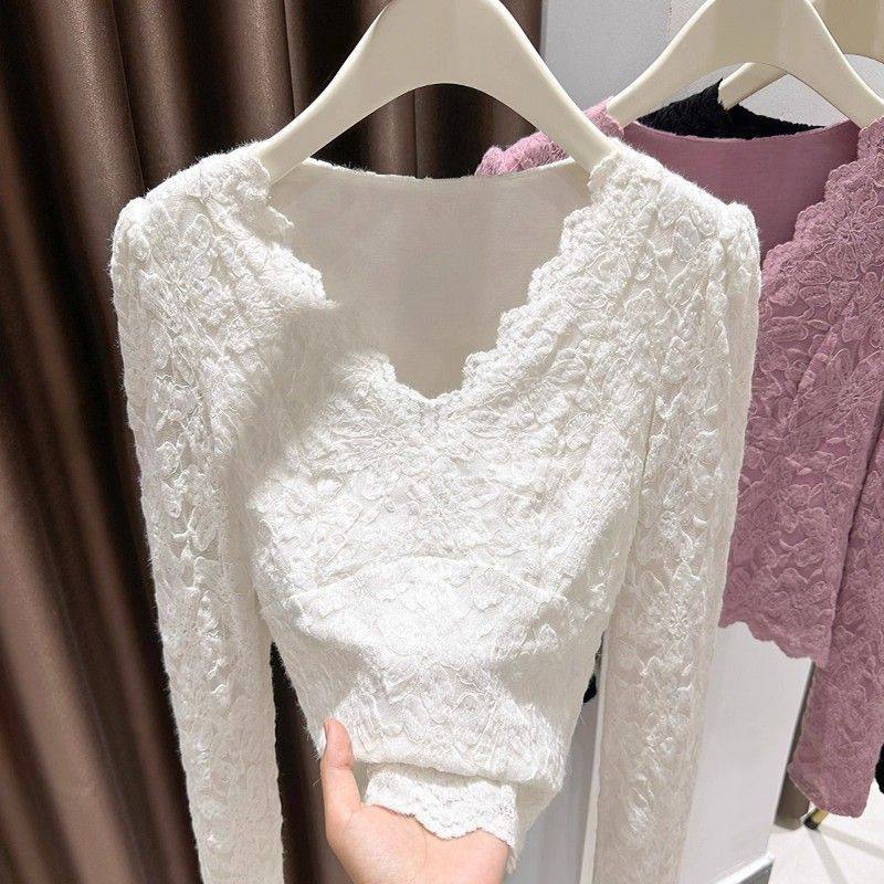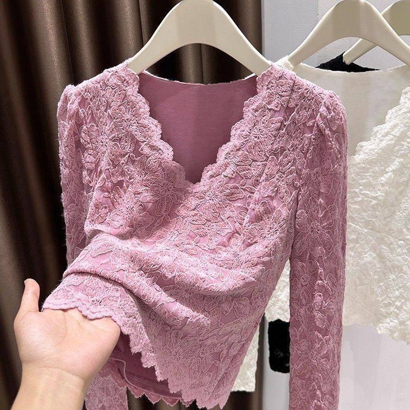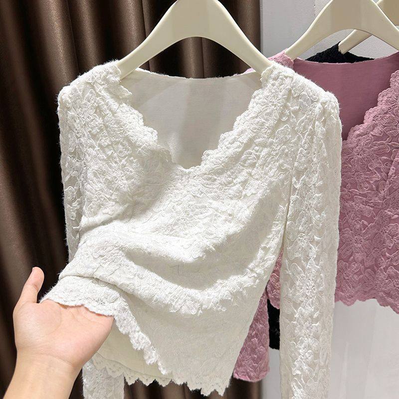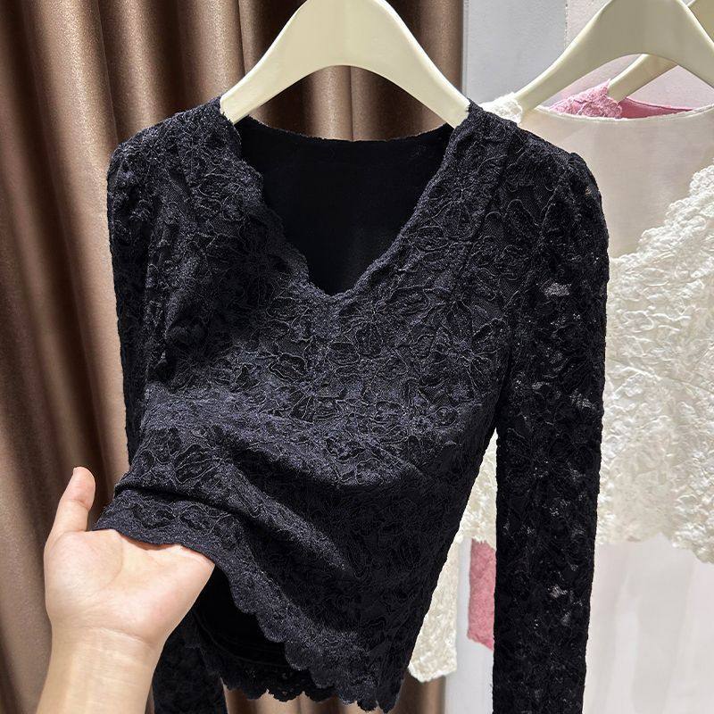 大码蕾丝加绒加厚打底衫女裝胖mm秋冬新款V领保暖内搭长袖T恤上衣