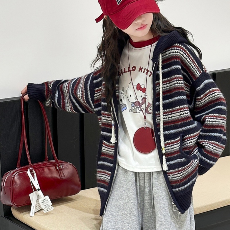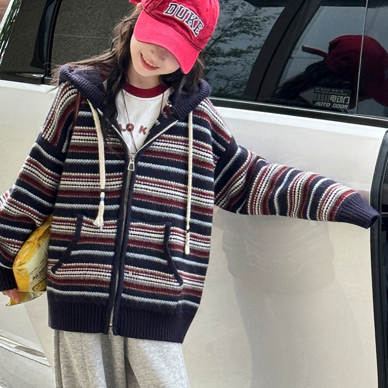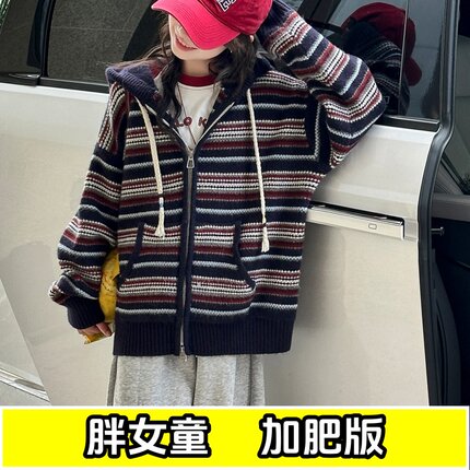 胖女童秋装加肥加大休闲条纹连帽毛衣外套加厚中大童儿童宽松上衣