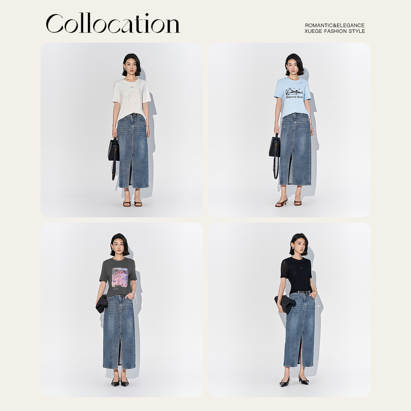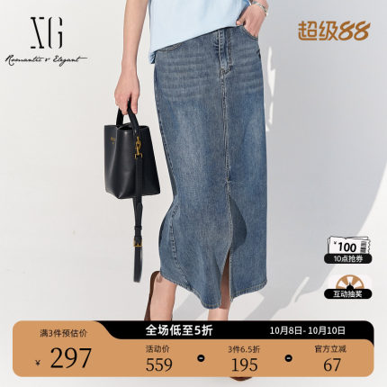XG雪歌中长款水洗牛仔半身裙2025夏季新款蓝色开叉设计中长裙女装