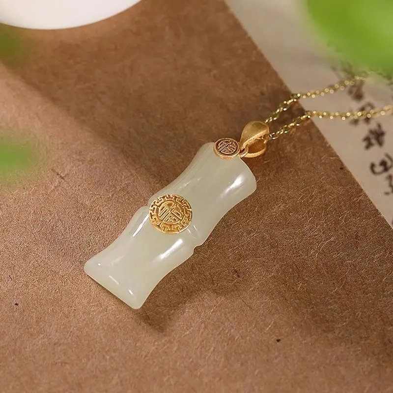 S925银镀金白玉竹节吊坠复古和田白玉福字气质文艺福禄吊坠男女款