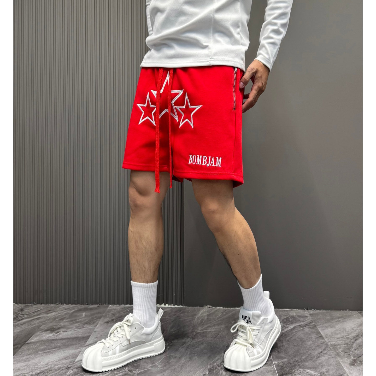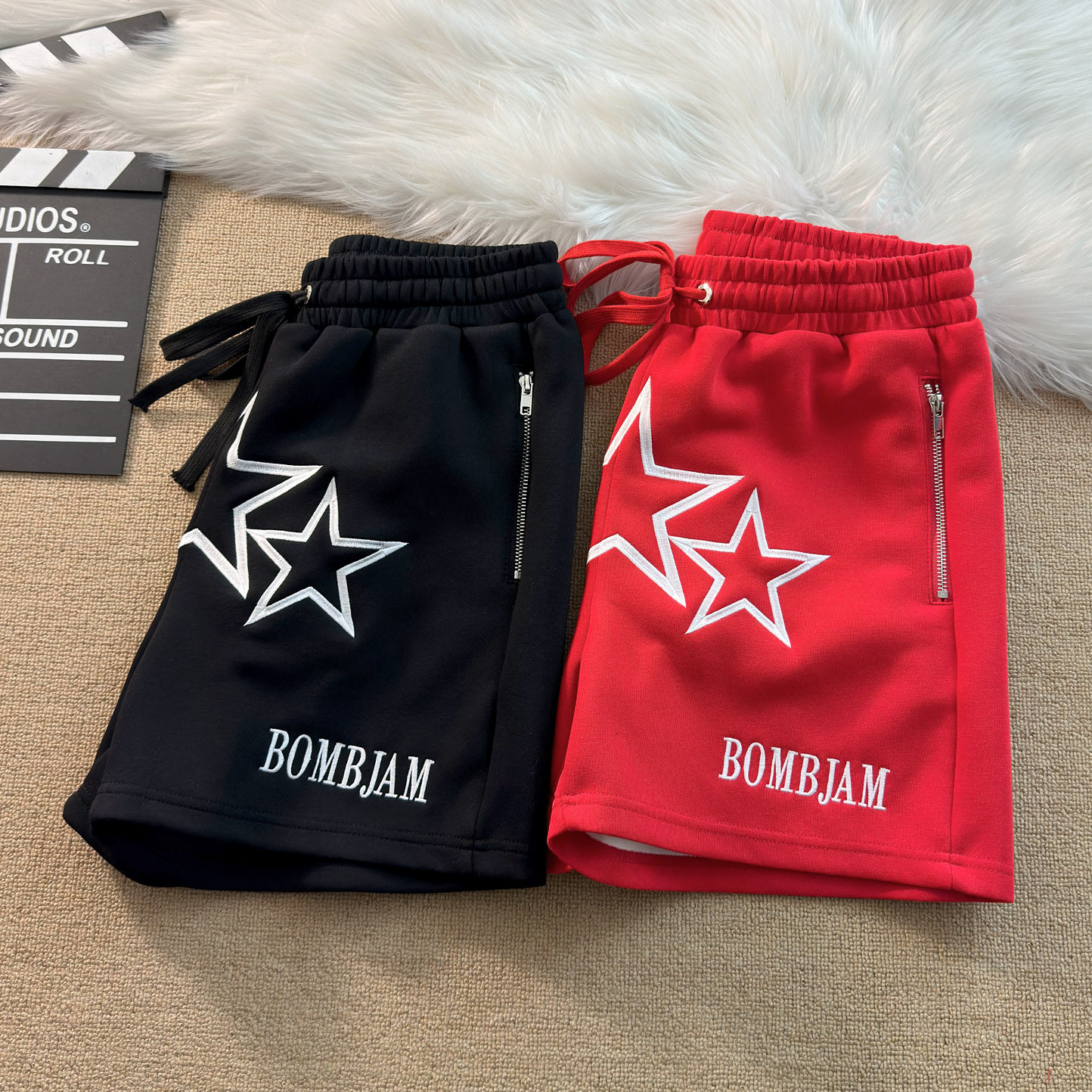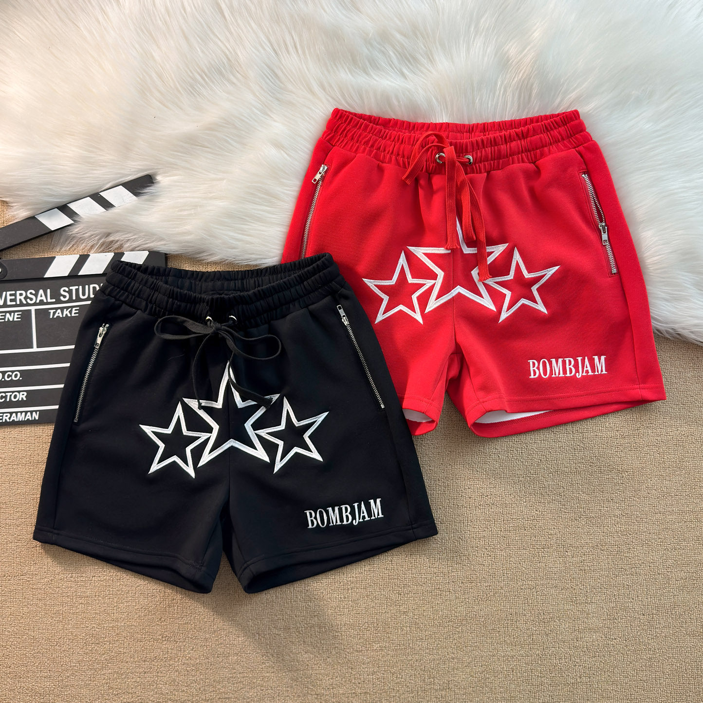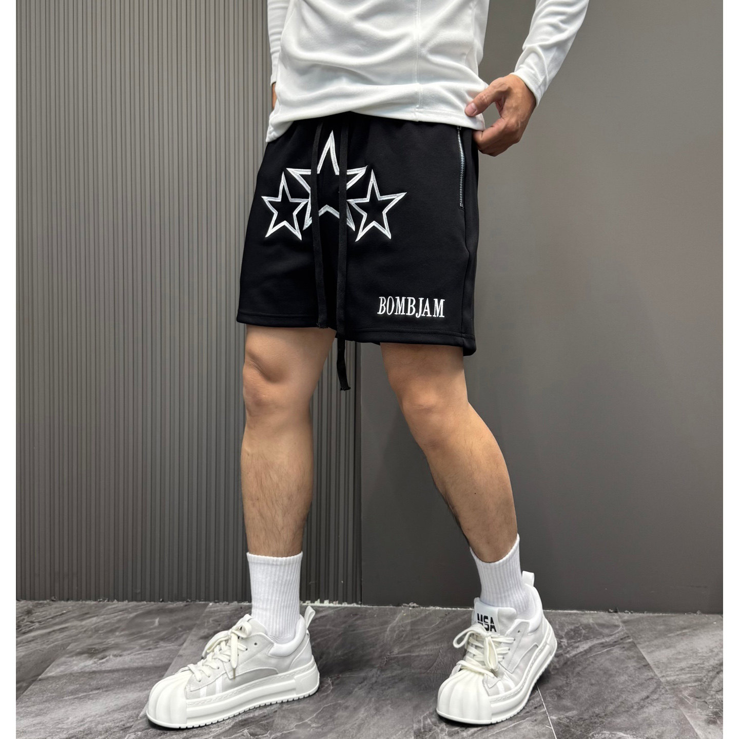 美式轻奢复古质感刺绣星星字母口袋拉链休闲短裤四分篮球裤宽松男