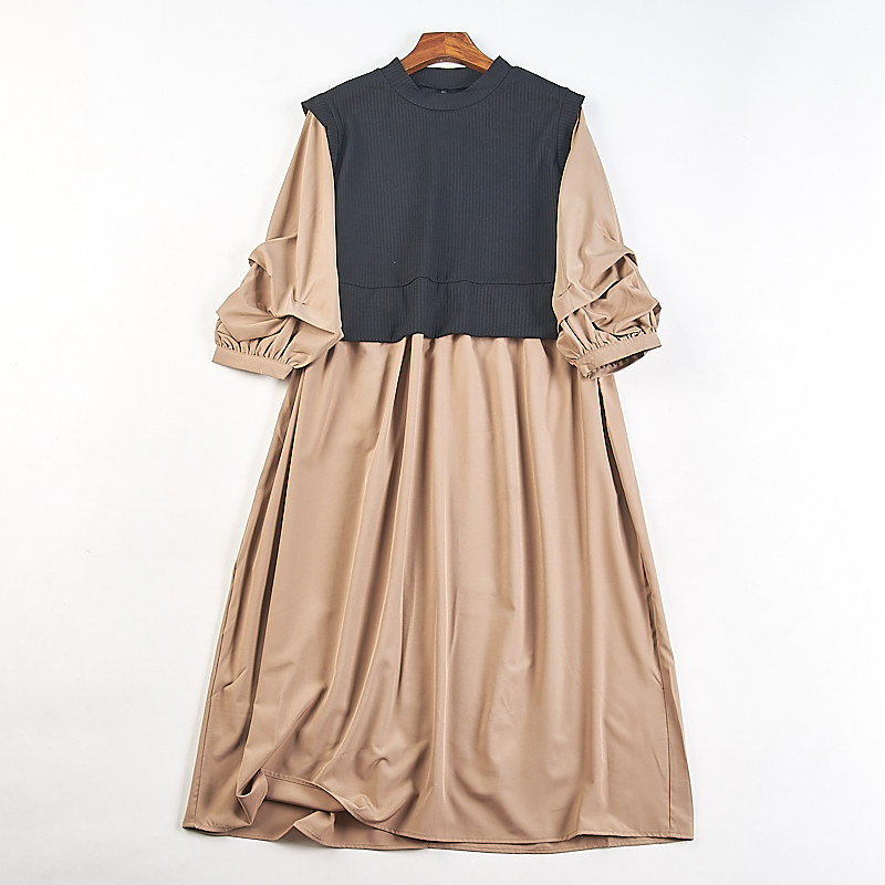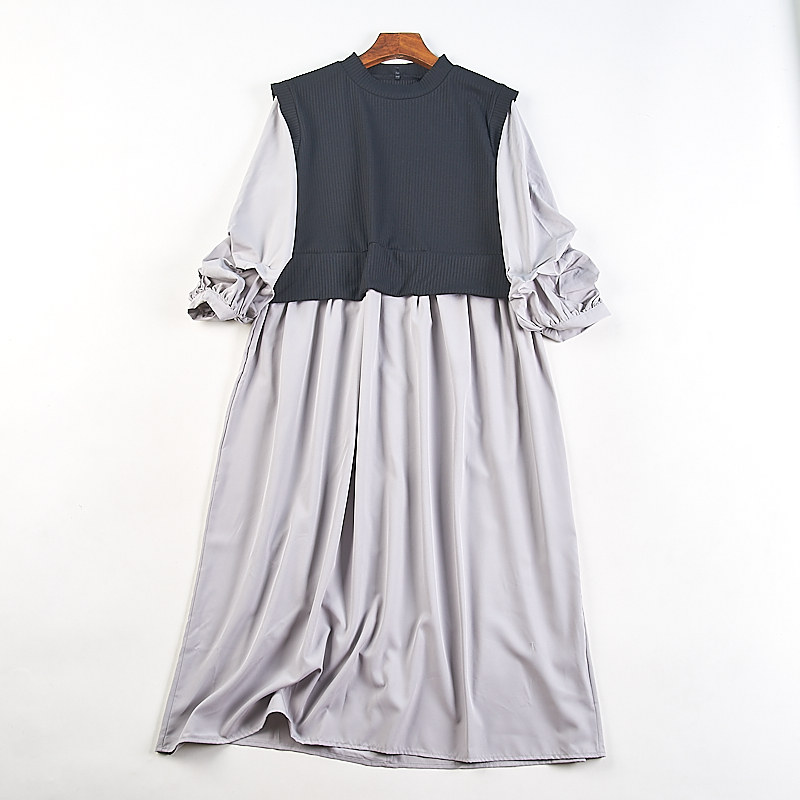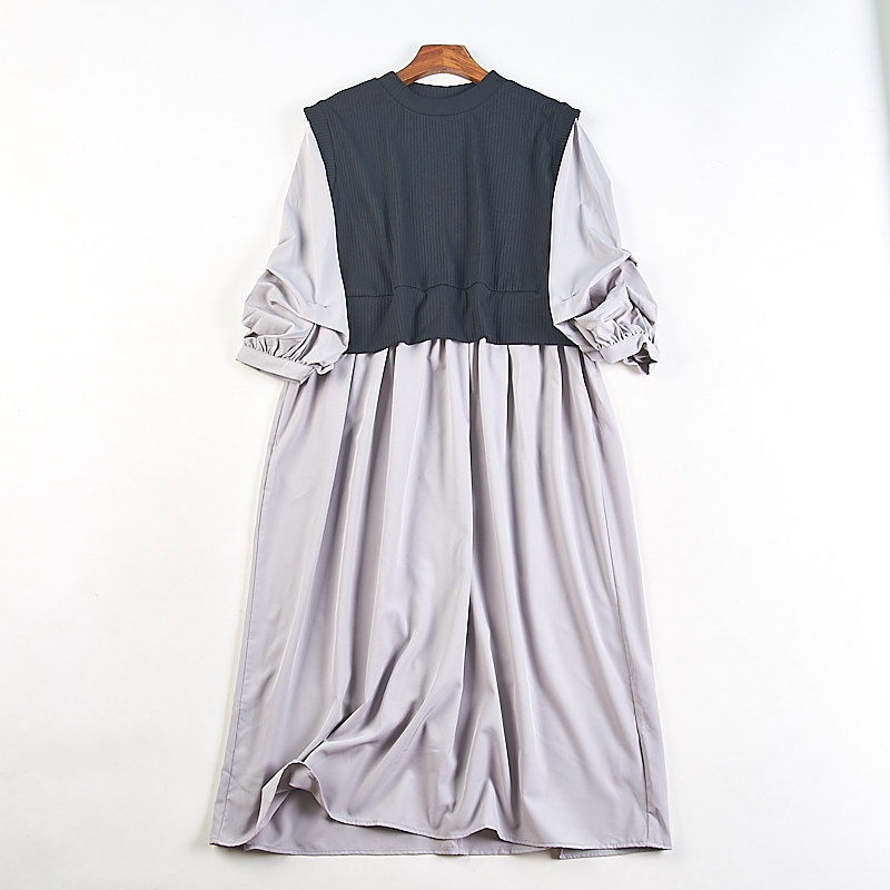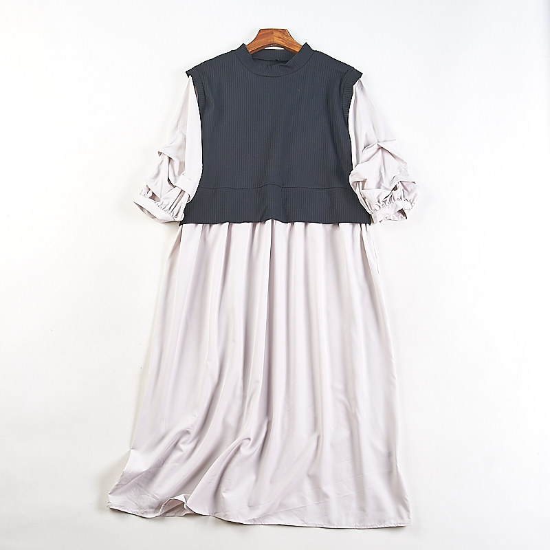 日单新款拼接假两件套连衣裙H82354春夏大码显瘦高圆领七分袖长裙