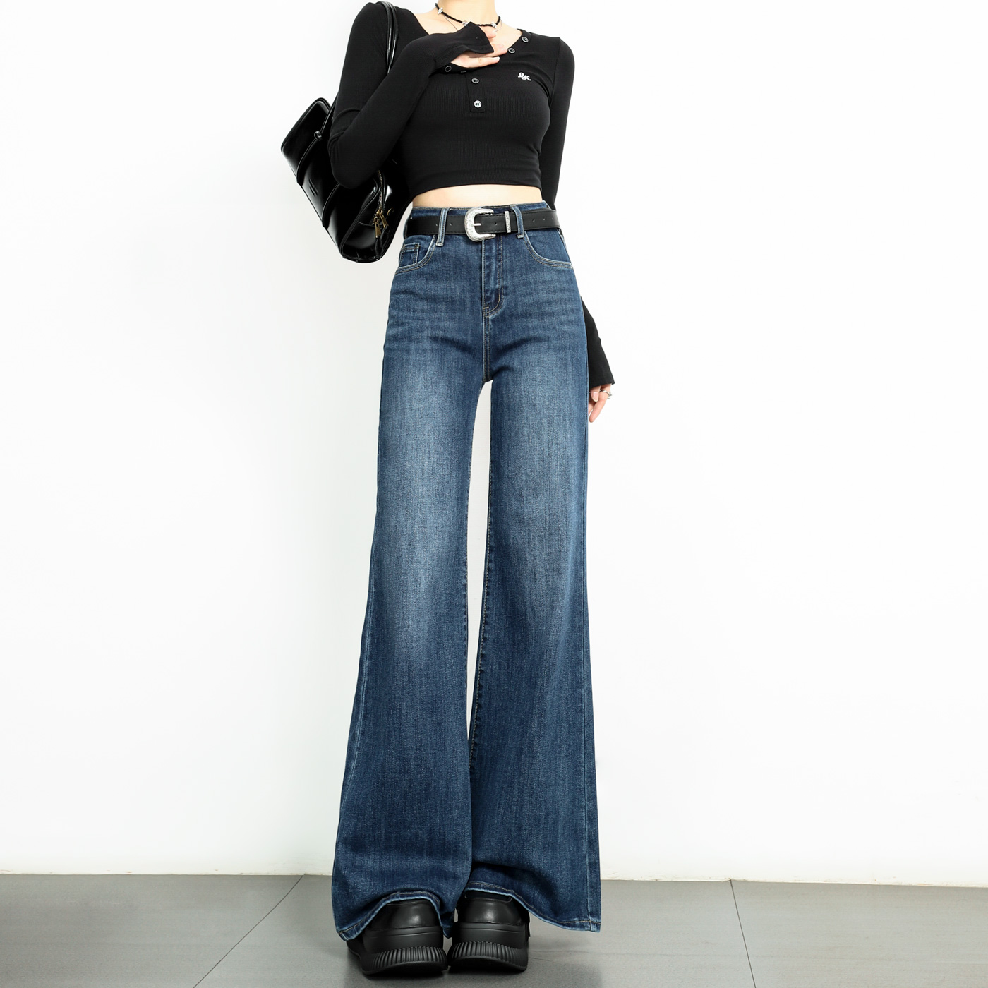 复古蓝色阔腿牛仔裤女秋冬季高腰宽松弹力显瘦直筒不贴腿微喇叭裤