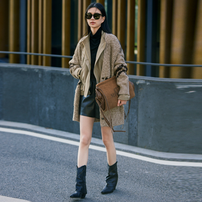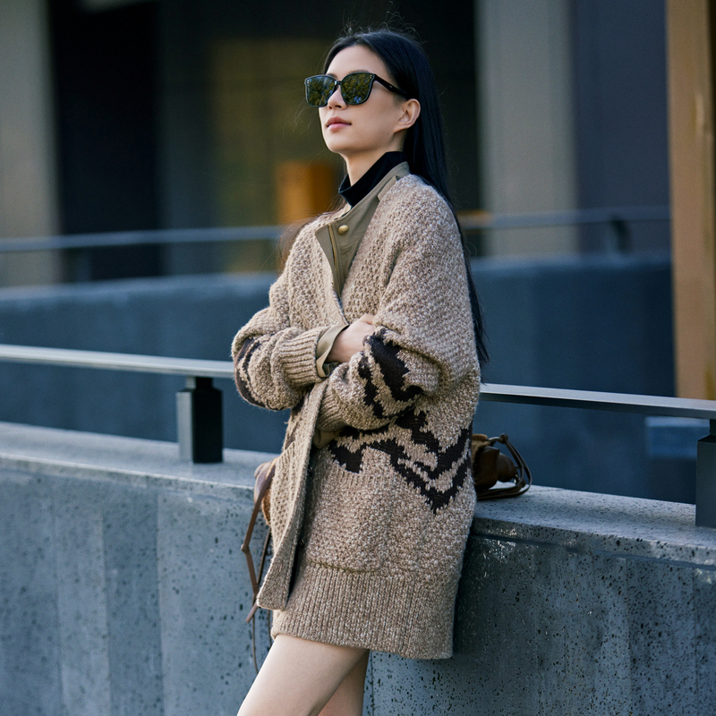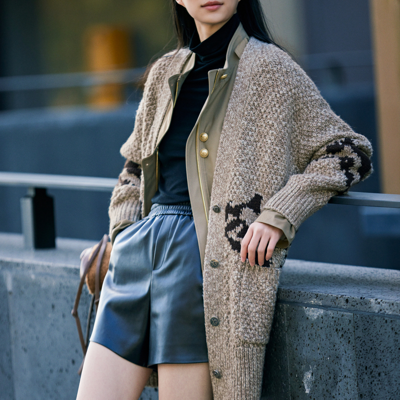 XG雪歌中长款浅米色毛针织衫2025冬季新款厚款长袖绵羊毛开衫女装