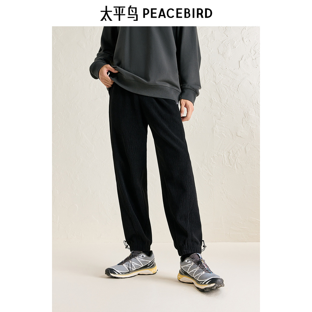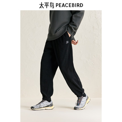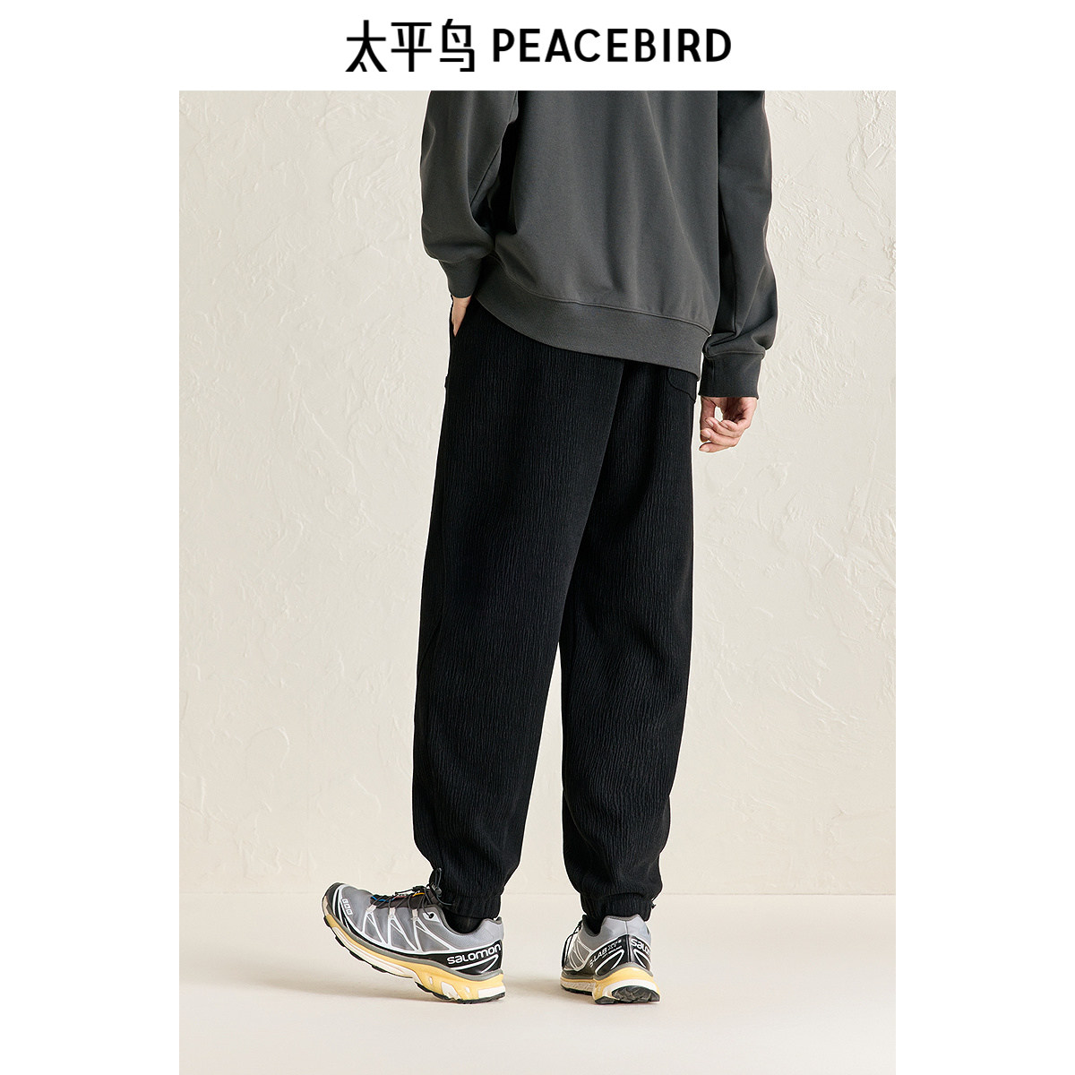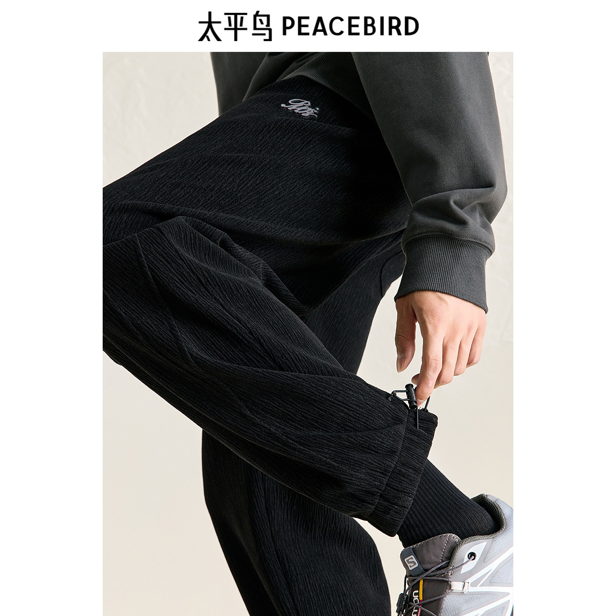 太平鸟男装休闲裤冬季质感束脚锥形裤绒感肌理刺绣保暖长裤黑