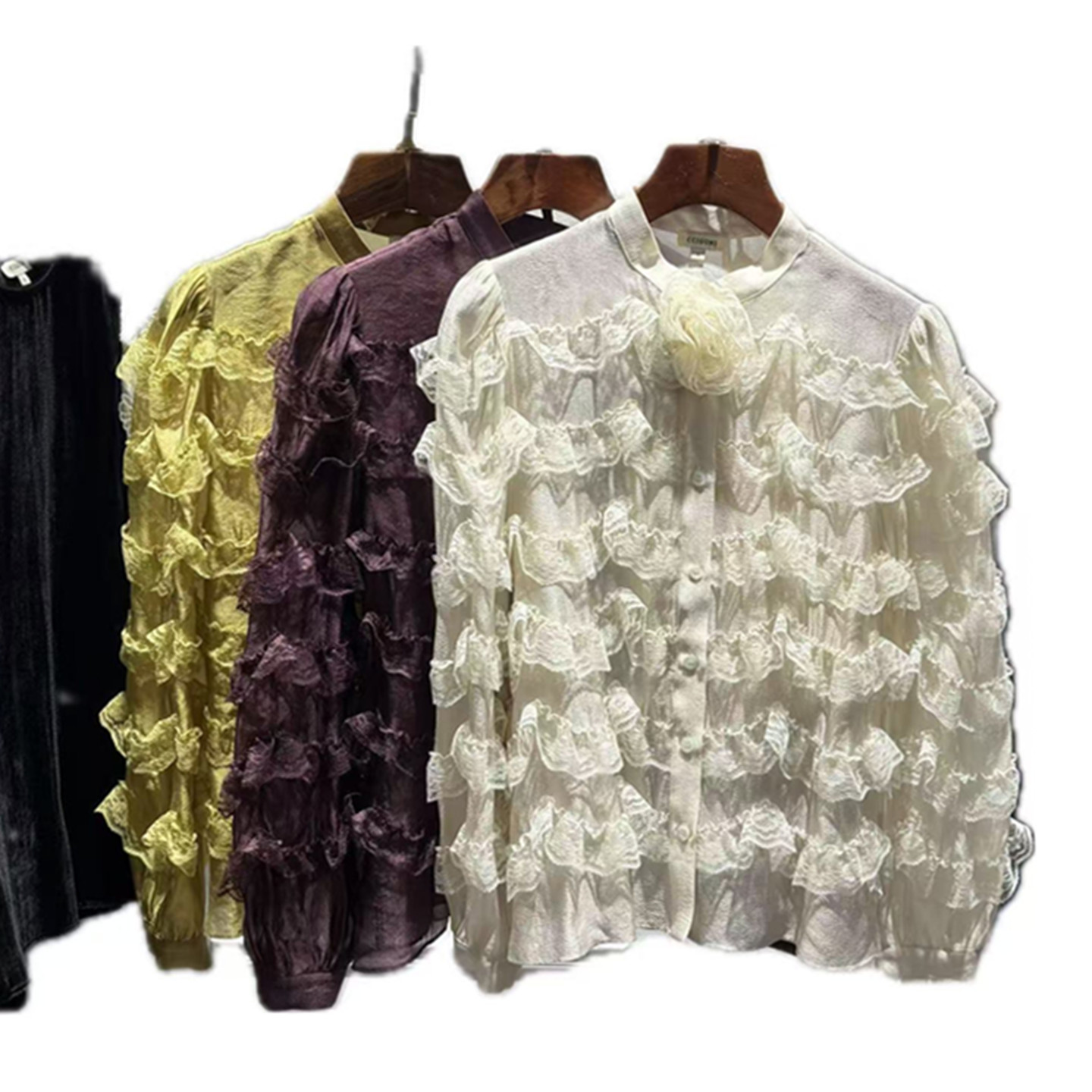 南油26春秋新品女装衬衫立体花朵蕾丝花边拼接圆领法式泡泡袖上衣