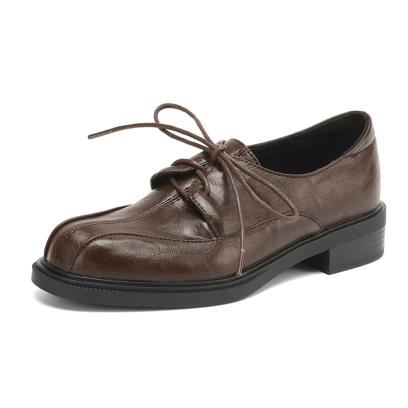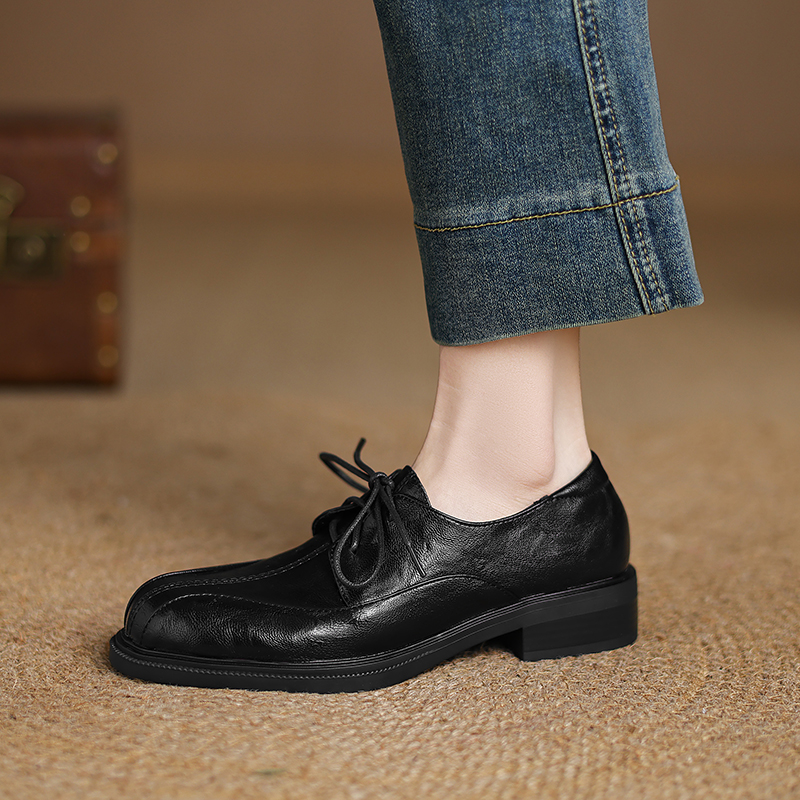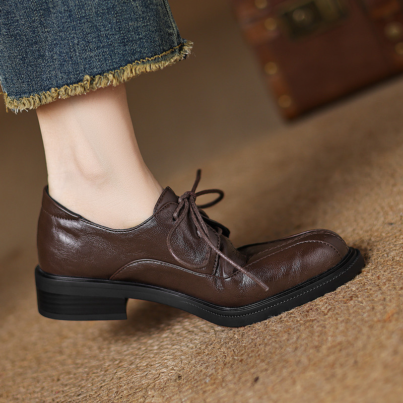 ladyblack粗中跟深口系带单鞋女春秋复古风圆头小皮鞋33大码41-43