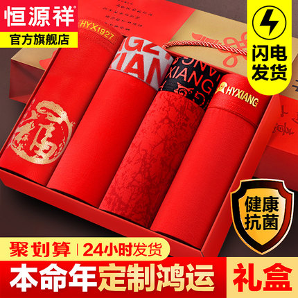 恒源祥男士内裤男平角裤透气本命年大红色结婚礼盒四角短裤属蛇年