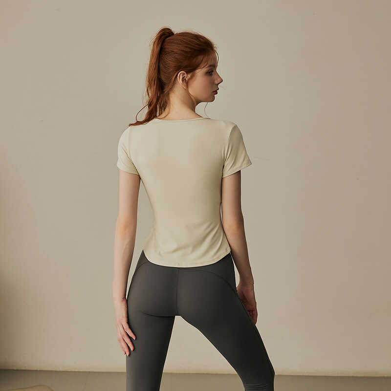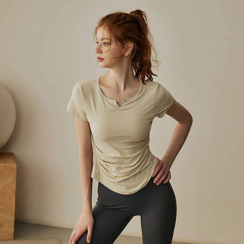 带胸垫短袖T恤女2025夏季新款罗纹运动上衣健身服薄款跑步瑜伽服