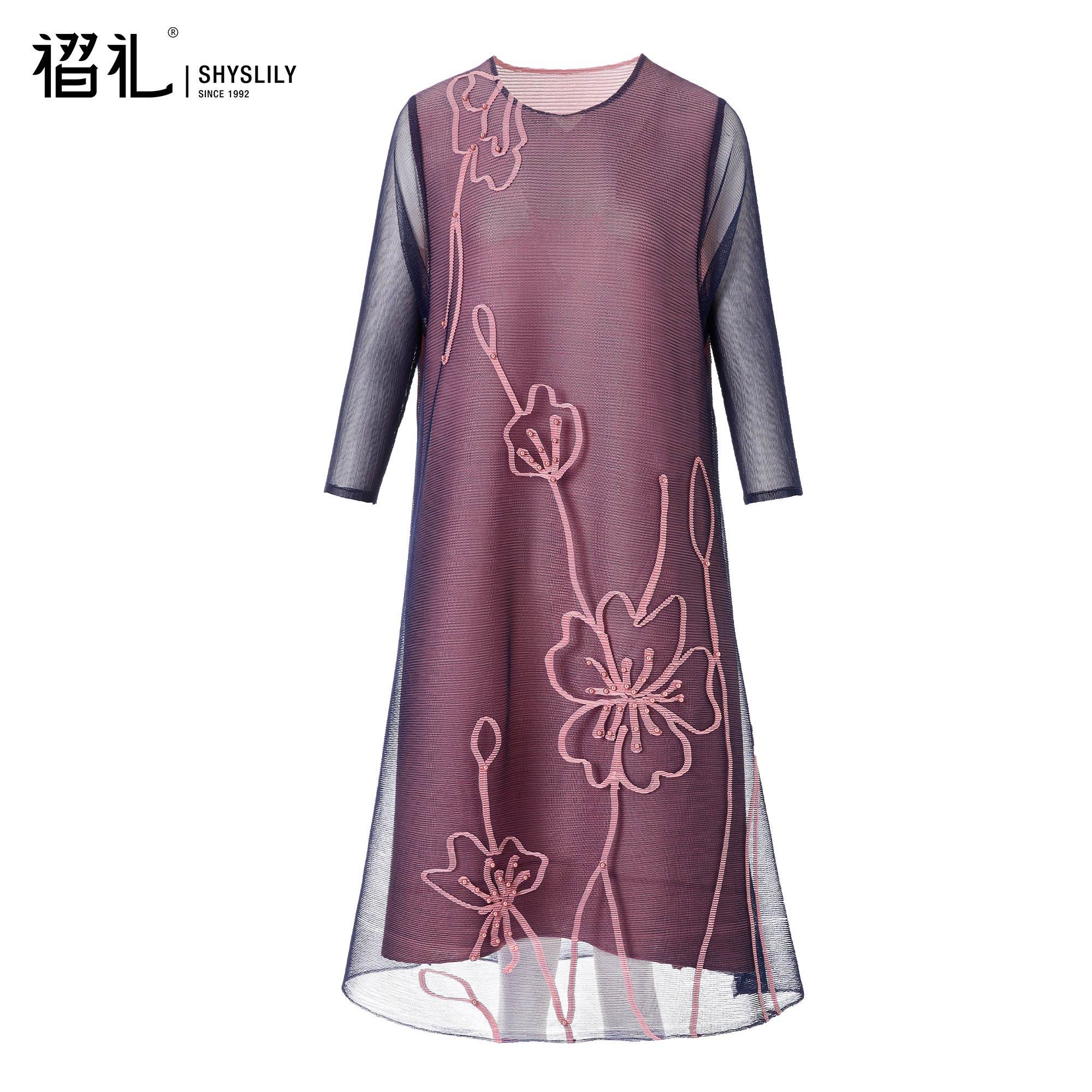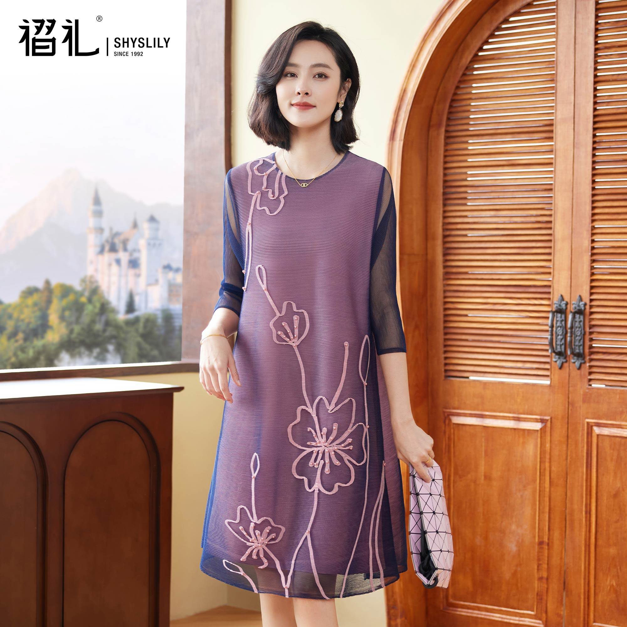 妈妈春装高端连衣裙网纱三宅褶皱