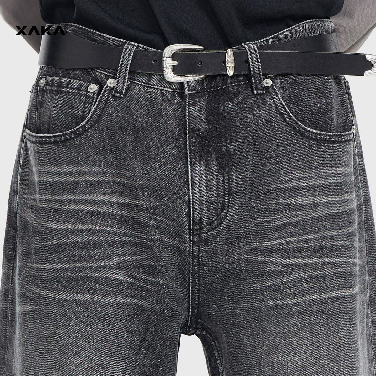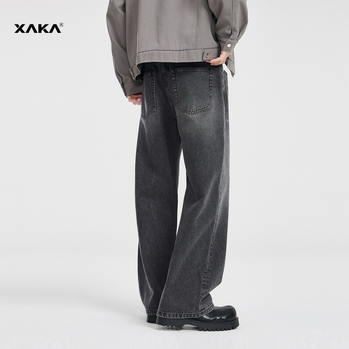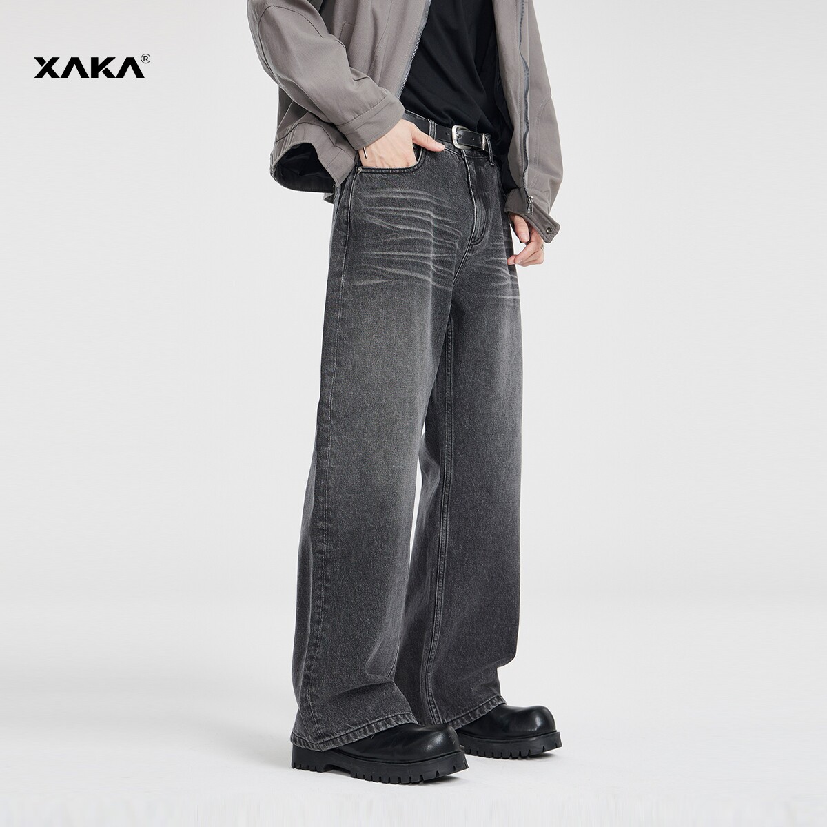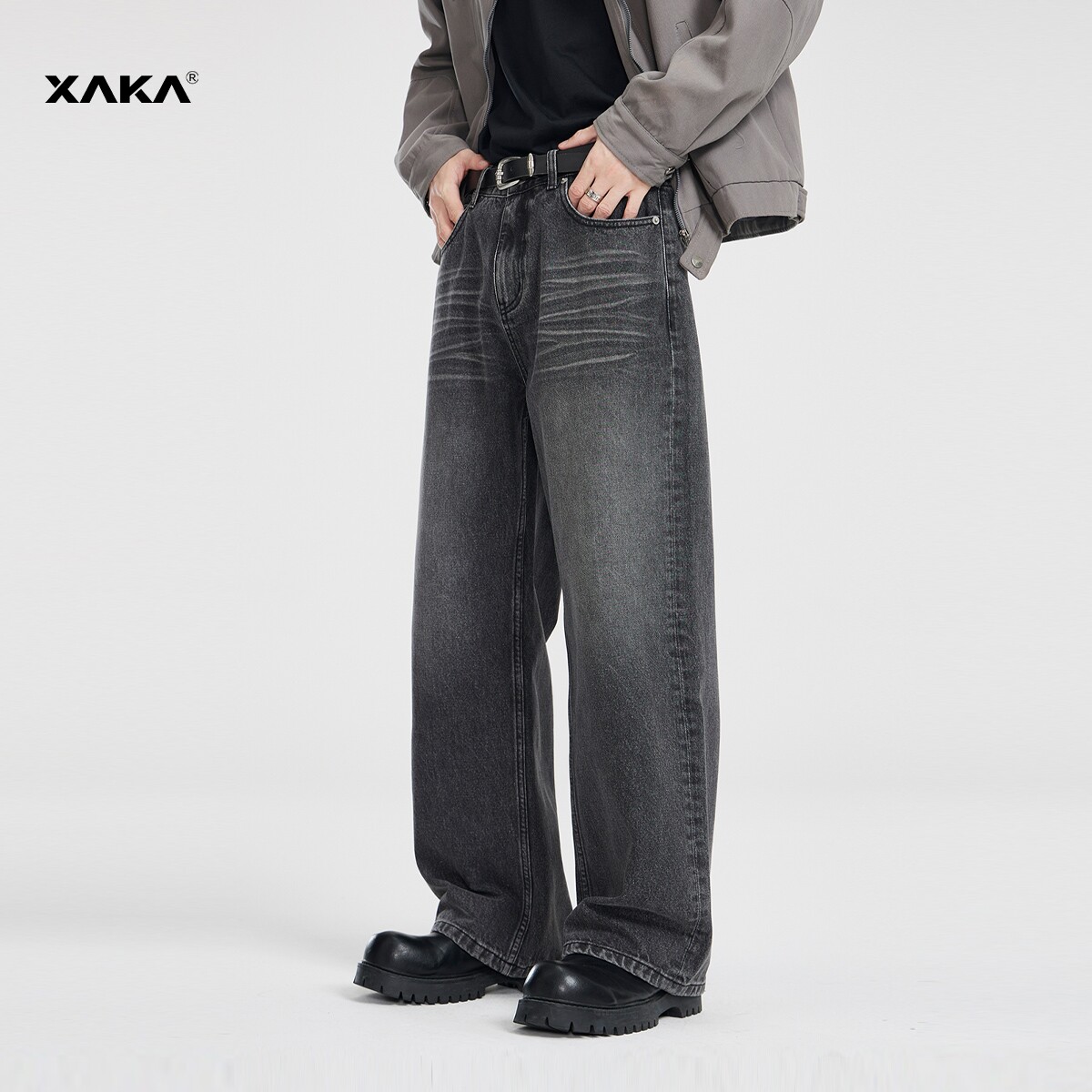 XAKA美式复古水洗黑色牛仔裤男2024新款潮流宽松直筒垂感阔腿长裤