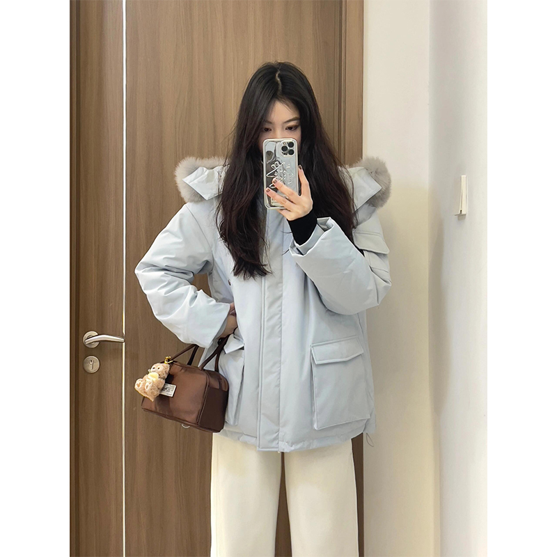 胖mm大码女装韩版加厚连帽羽绒棉服女冬季新款蓝色宽松保暖外套女