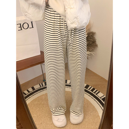150小个子黑白条纹阔腿裤女秋冬加绒加厚抽绳155小码休闲直筒裤子