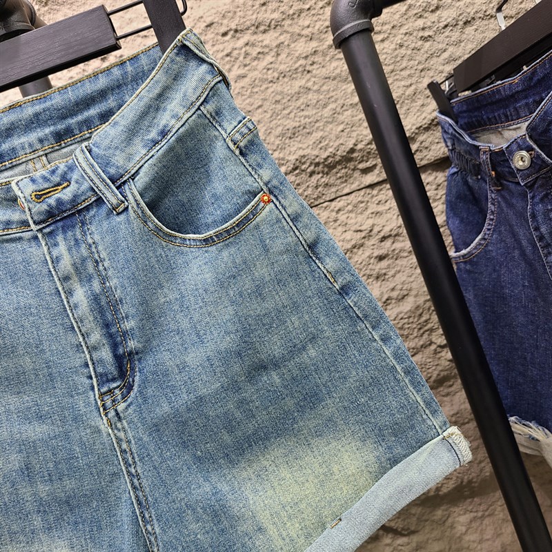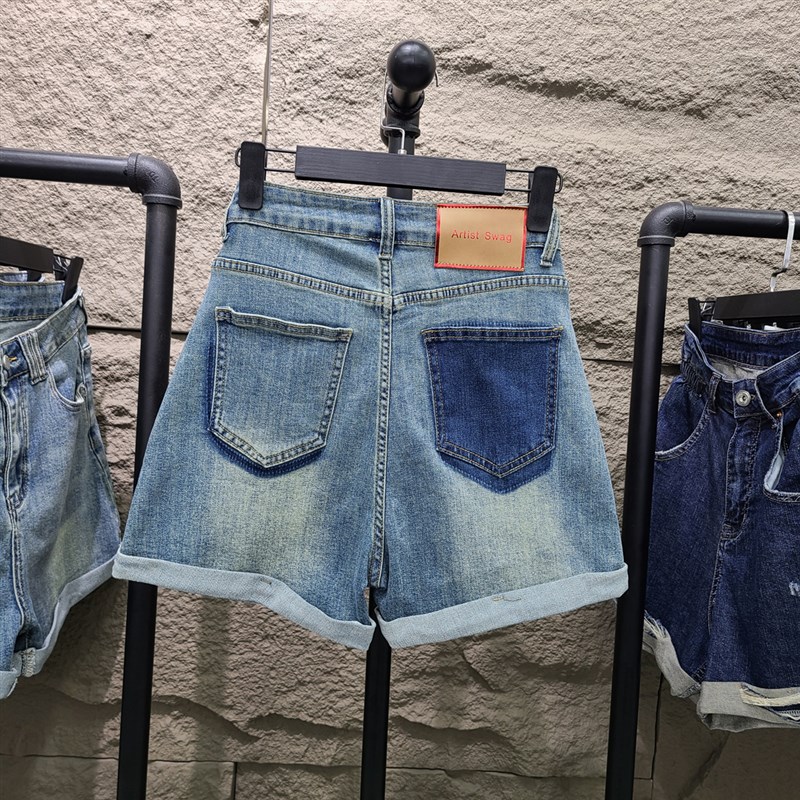 欧货夏季新款怀旧蓝色阔腿牛仔短裤女宽松高腰大码翻边哈伦短热裤