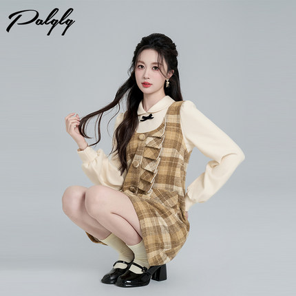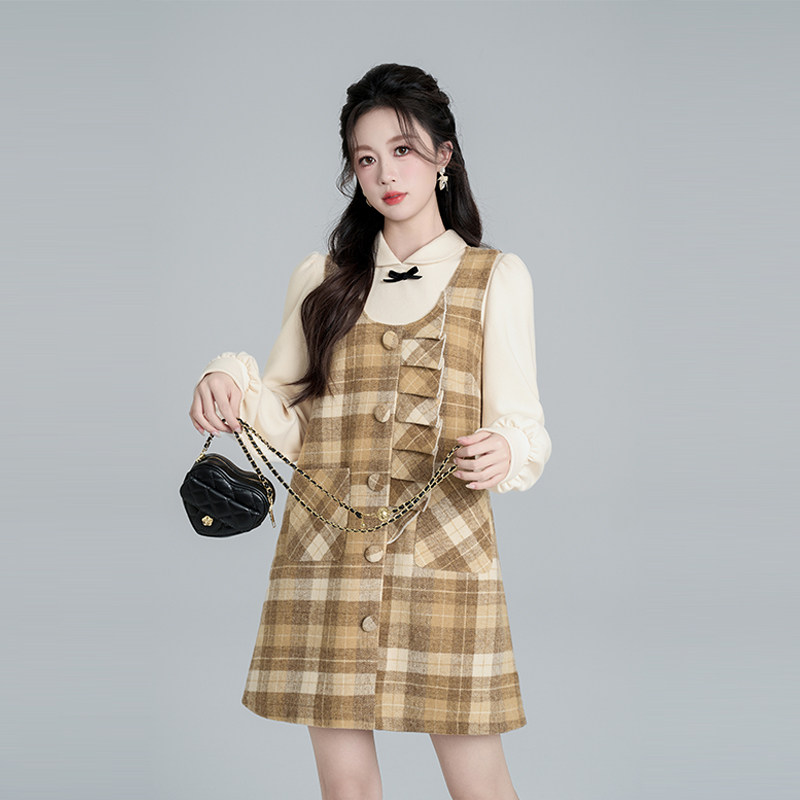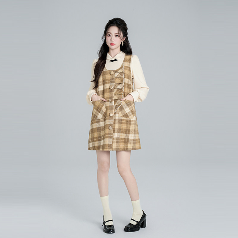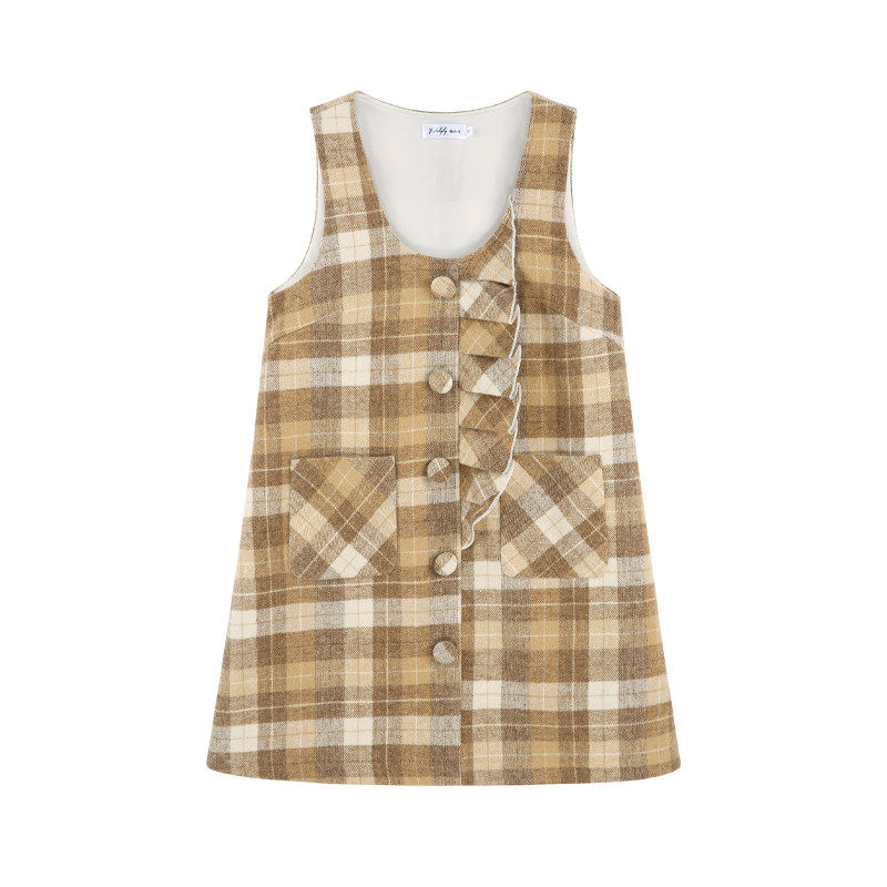 法式小香风黄色格子毛呢背心连衣裙女冬装洋气高级感直筒背带裙子