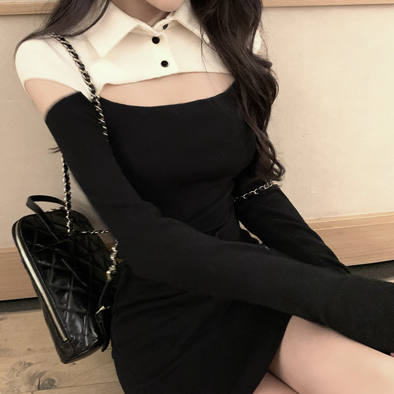 韩雨嘉撞色拼接polo领镂空连衣裙女秋冬长袖打底内搭裙纯欲包臀裙